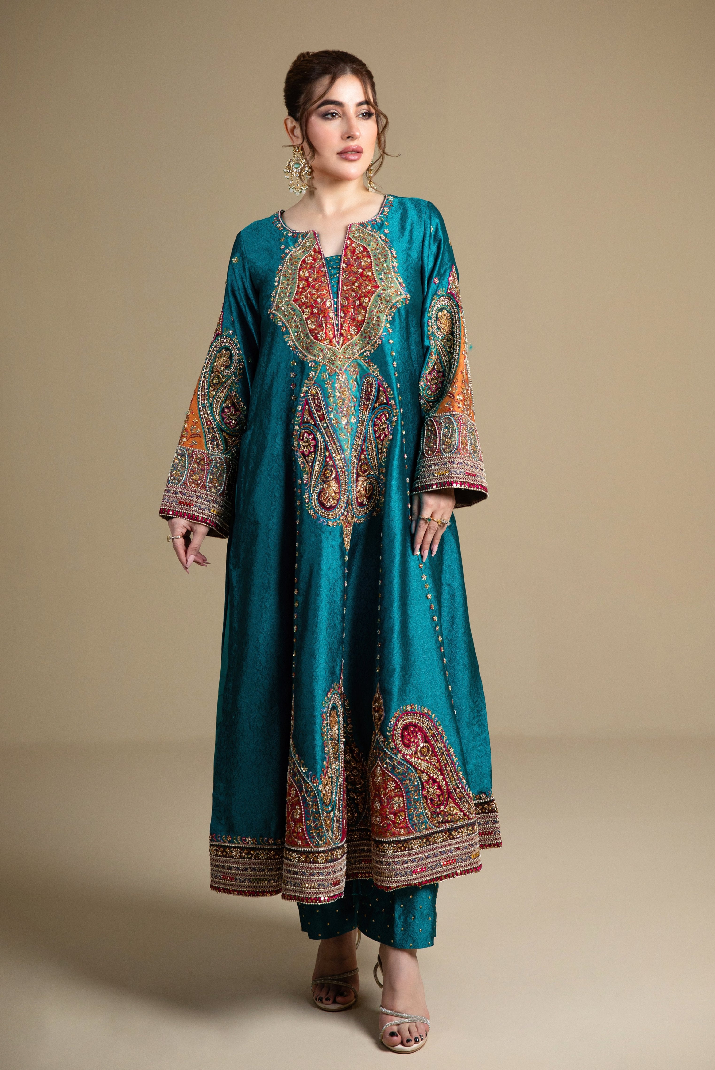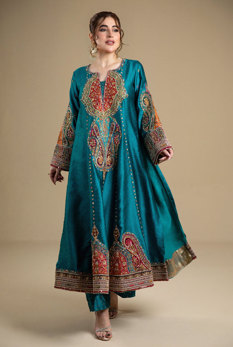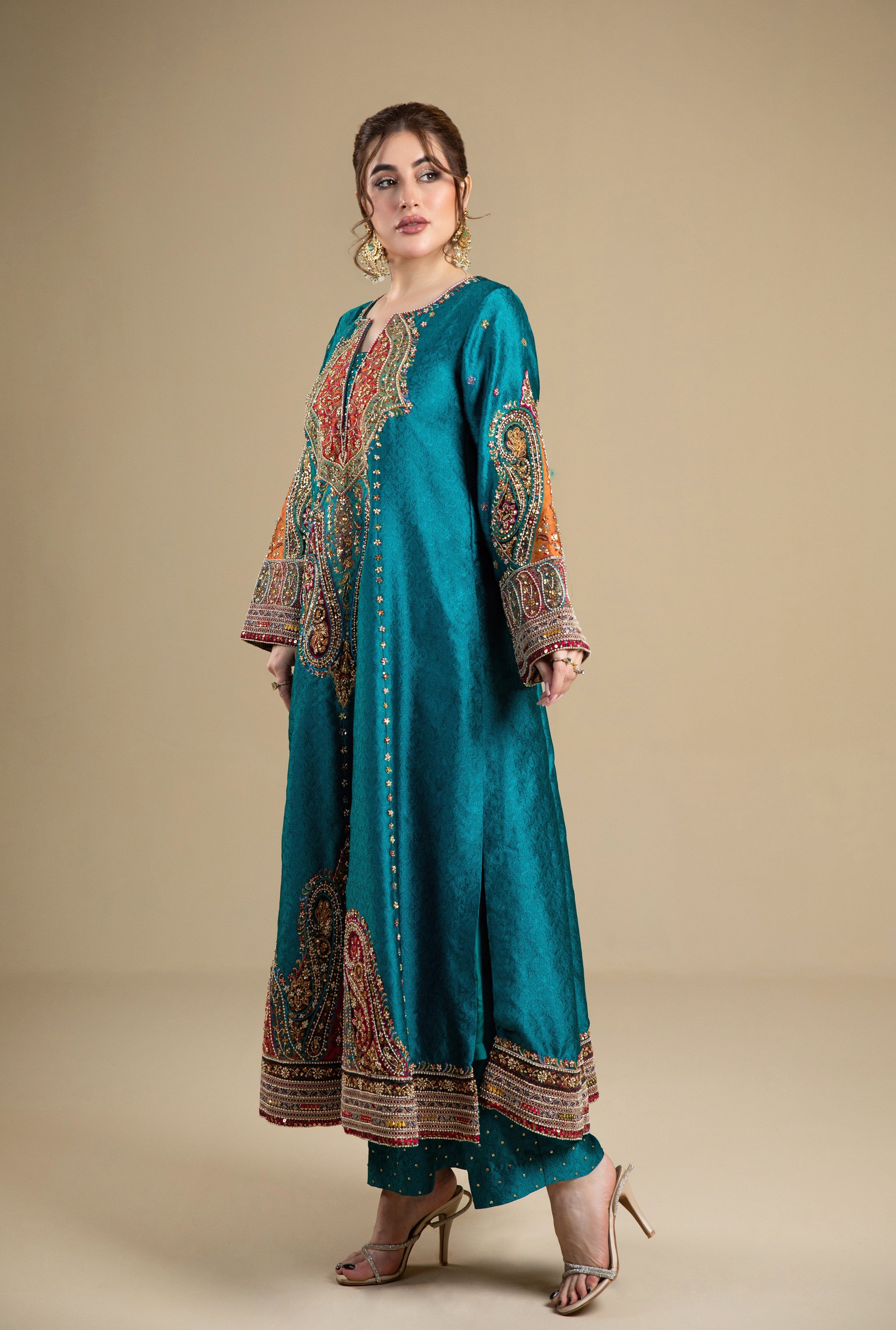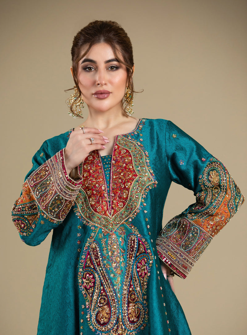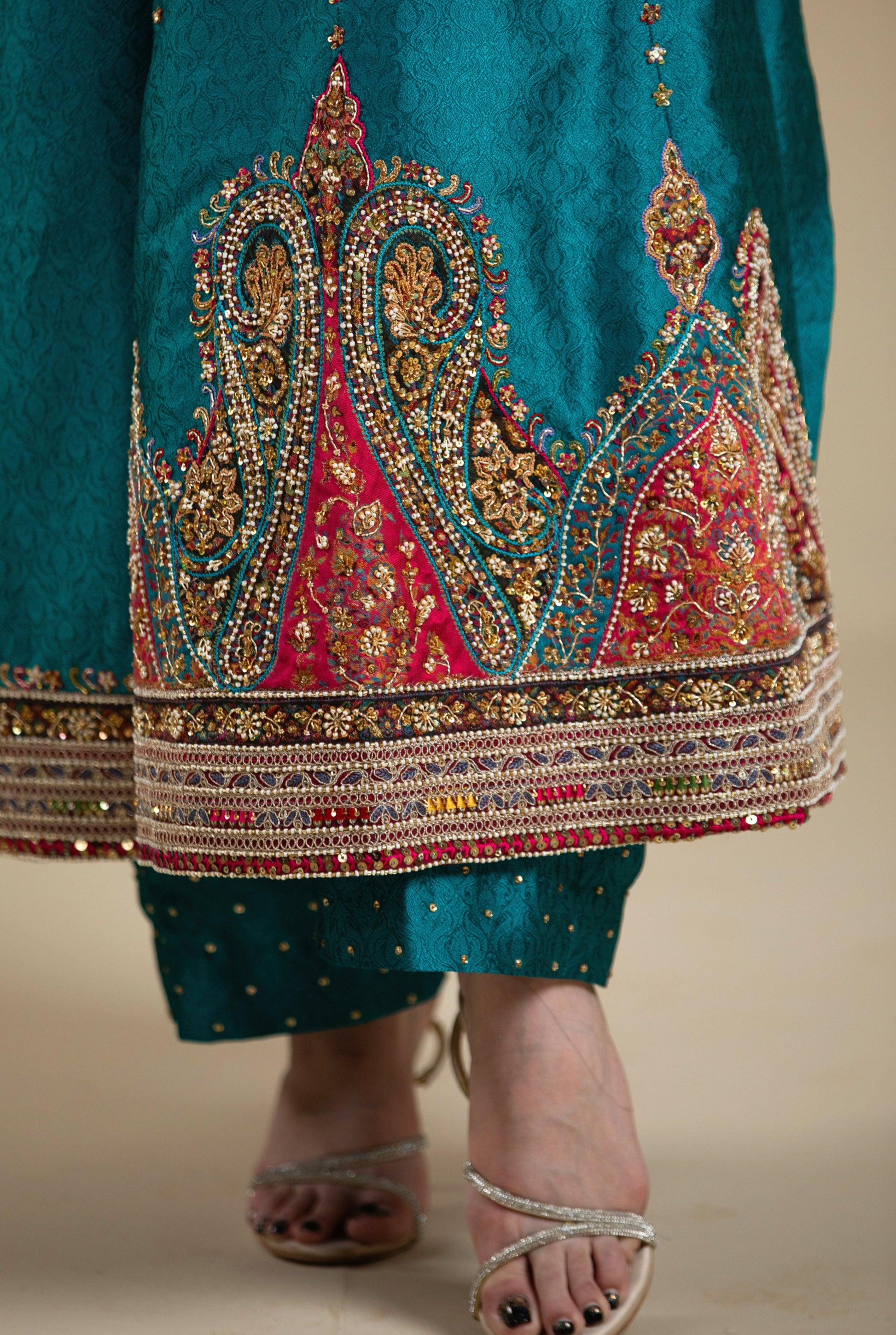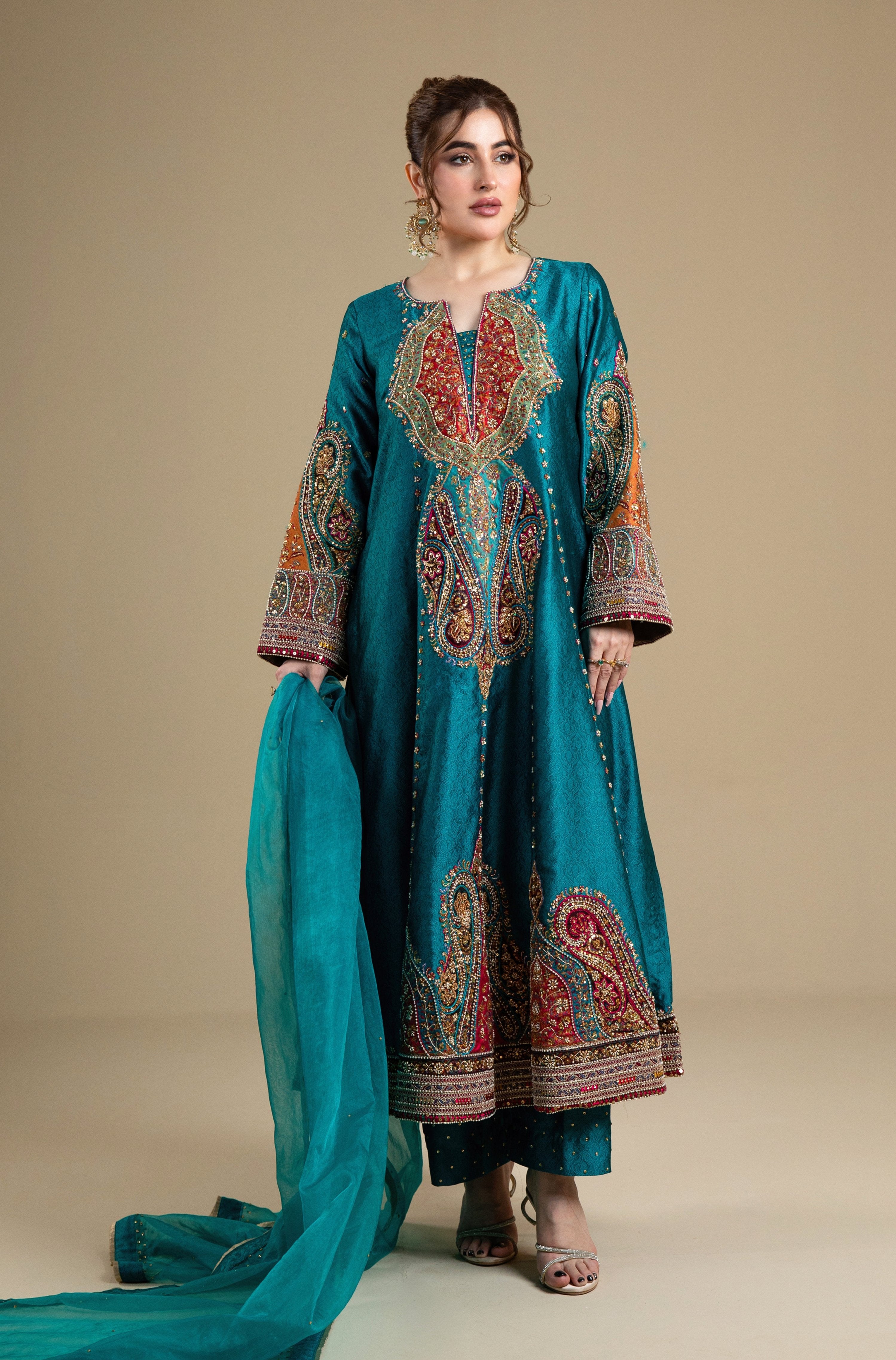 Together, the combination of the rich aqua shade, the intricate paisley motif, and the luxurious handwork creates an enchanting look that radiates sophistication and charm.