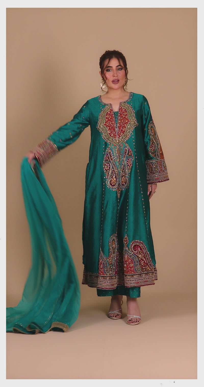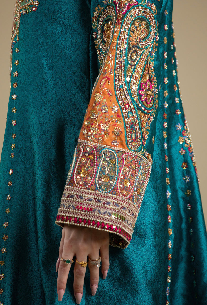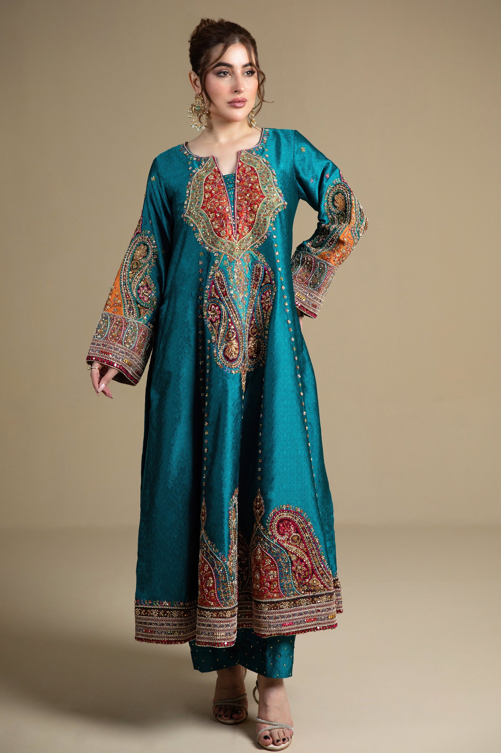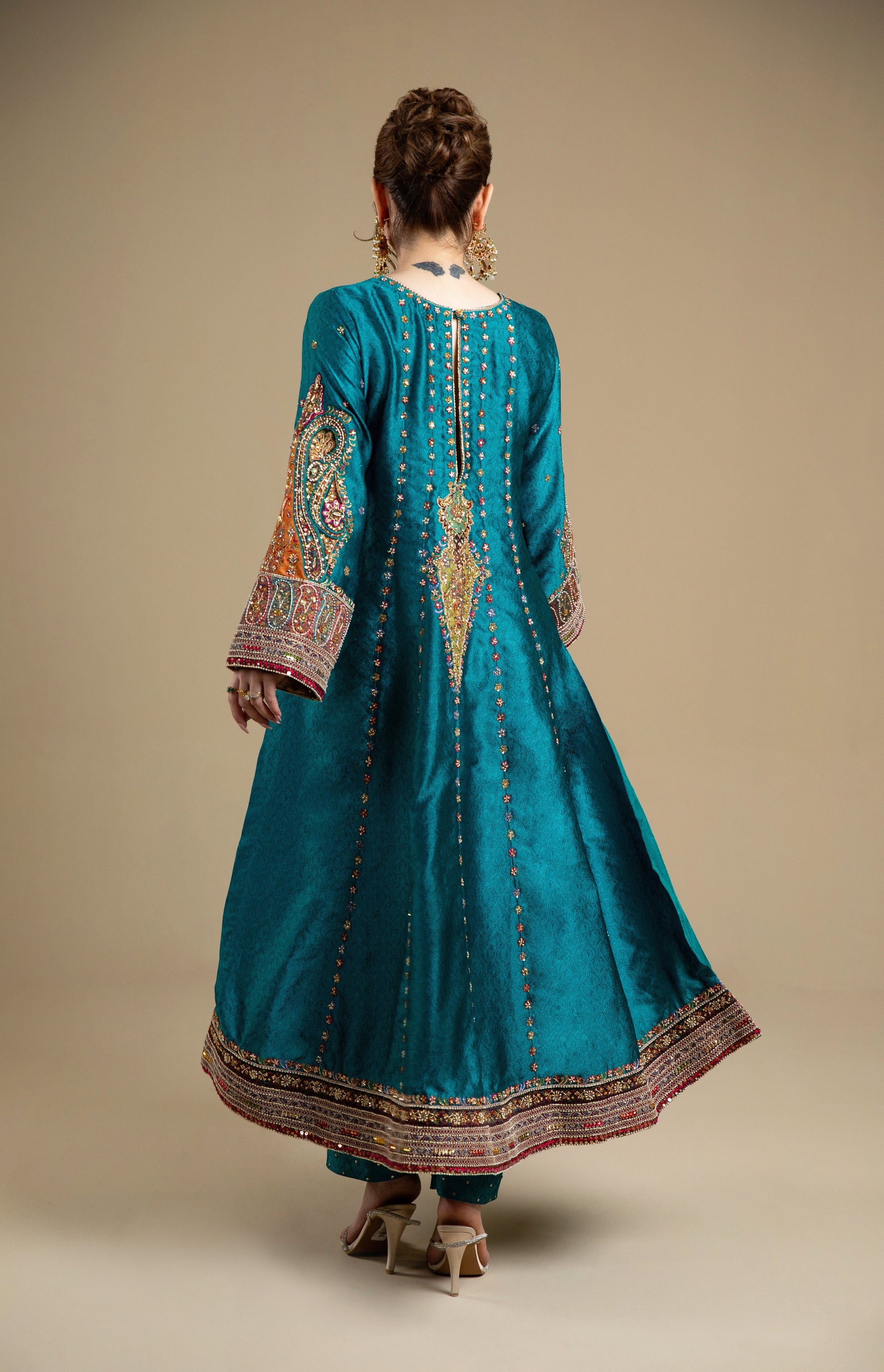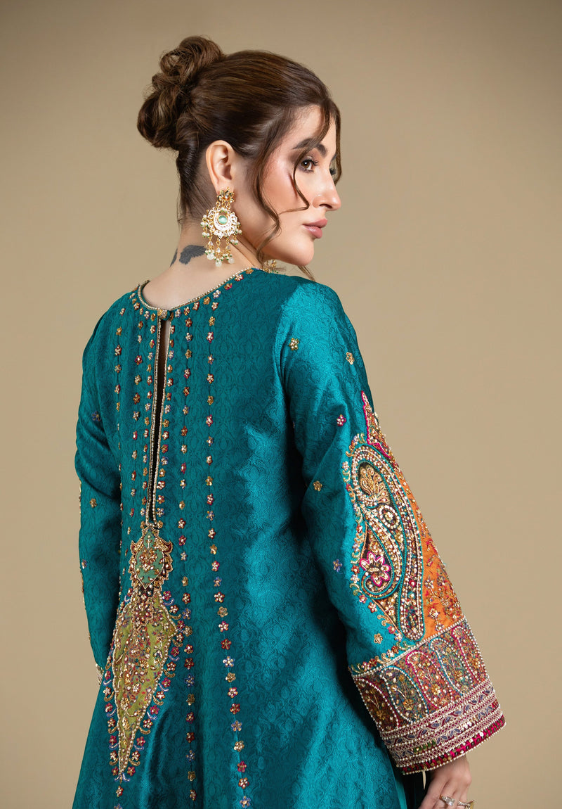 Together, the combination of the rich aqua shade, the intricate paisley motif, and the luxurious handwork creates an enchanting look that radiates sophistication and charm.