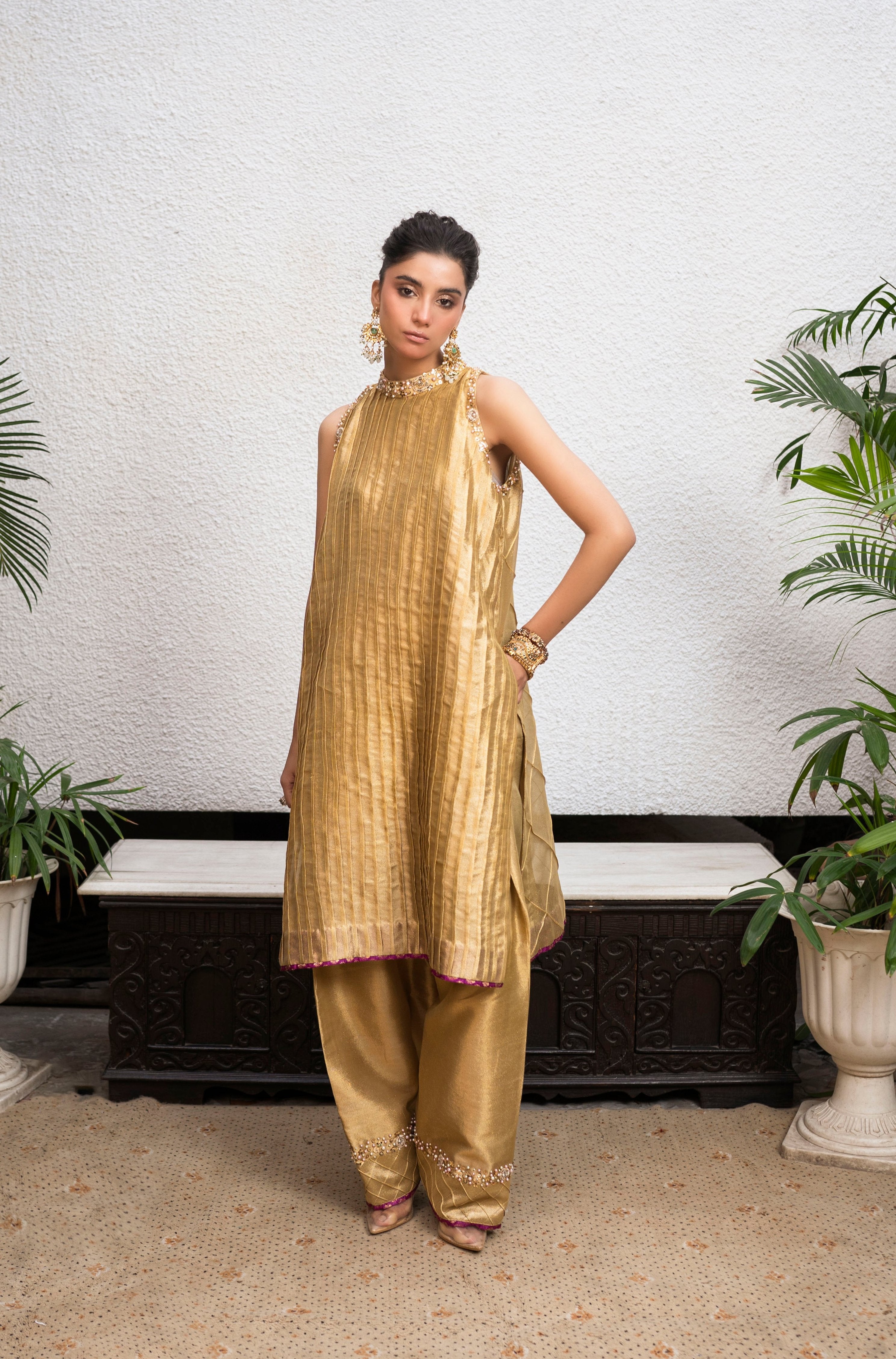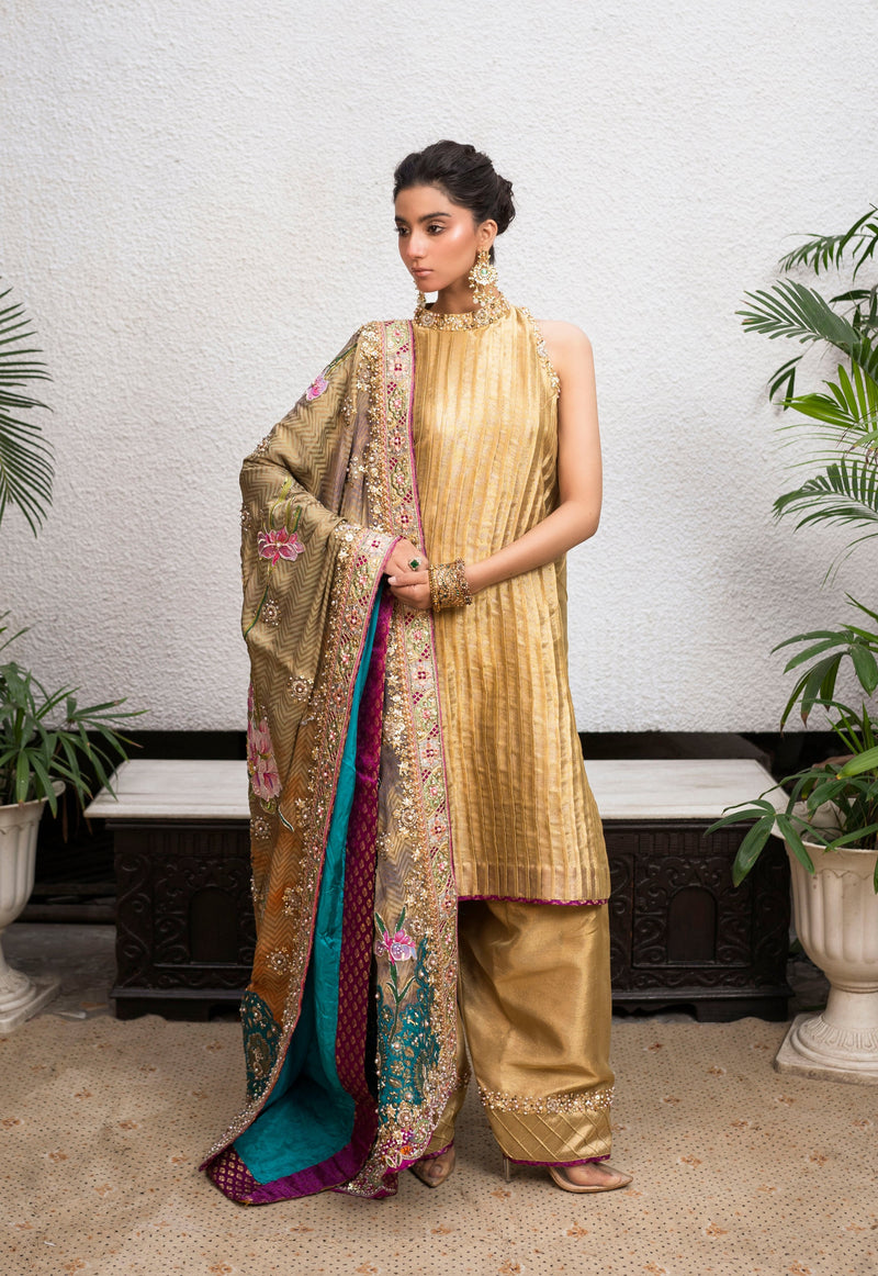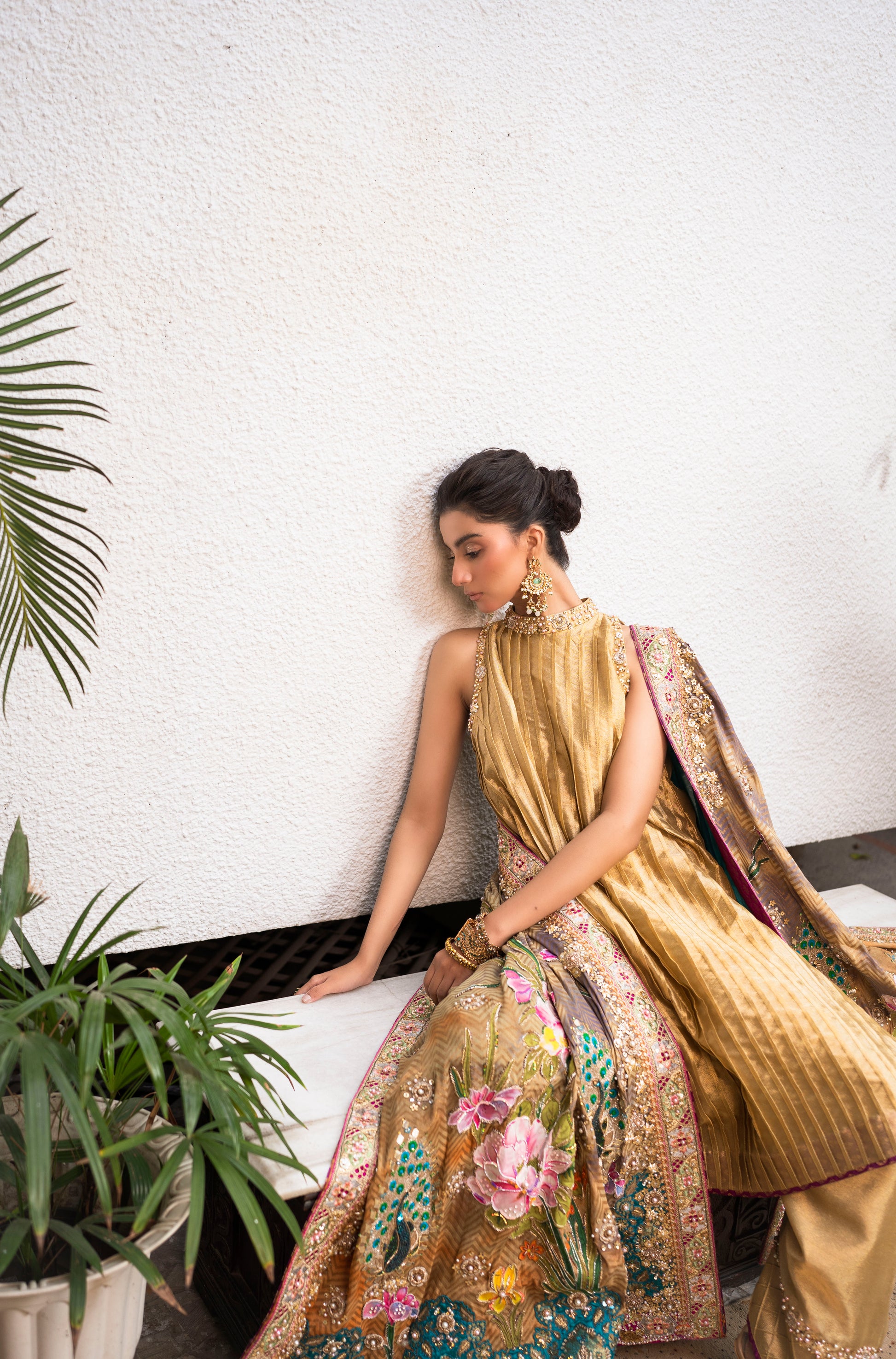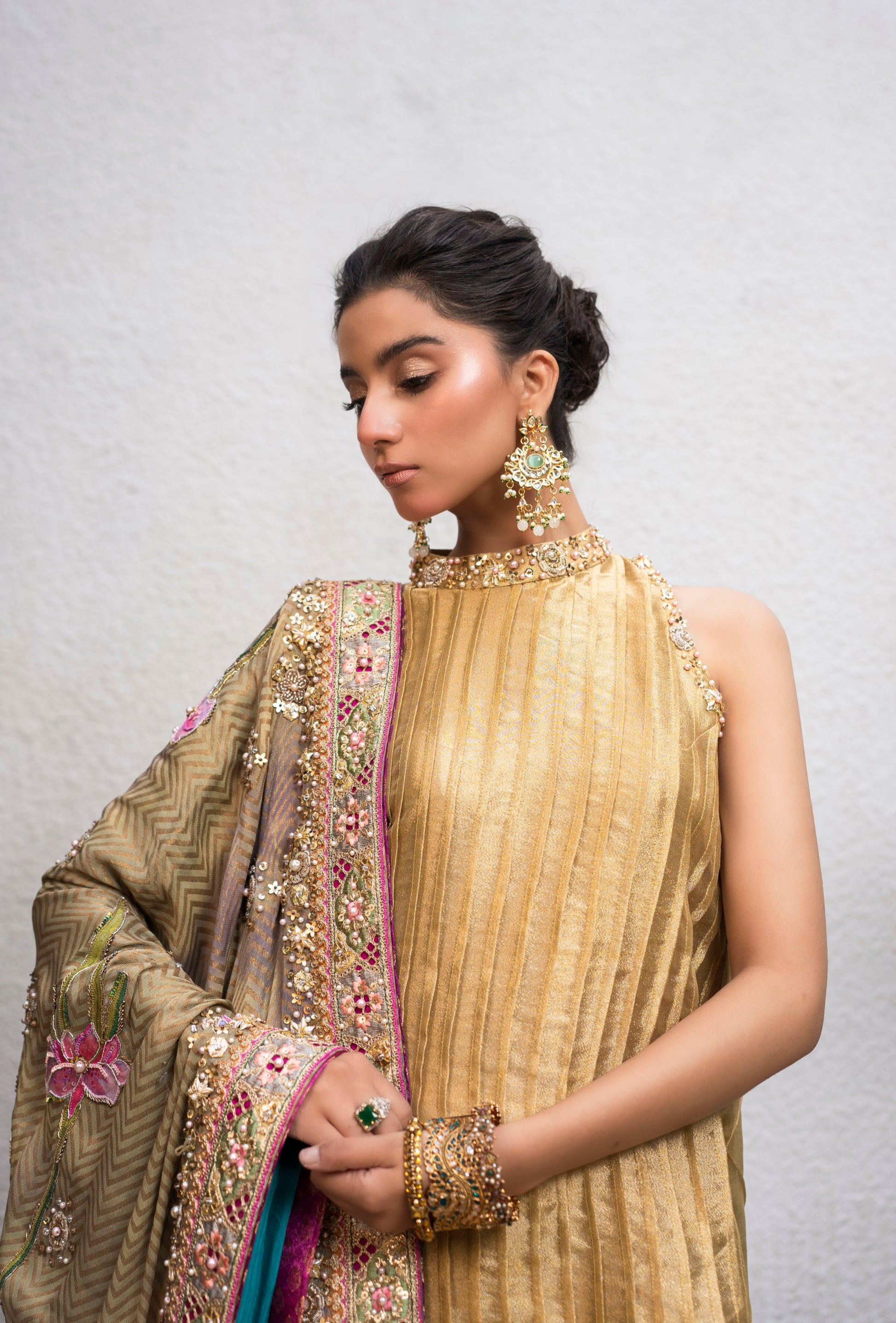 This breathtaking ensemble features a gold tissue halter kameez, exuding a luxurious sheen that catches the light with every movement. The kameez is delicately embellished with intricate beadwork, adding a touch of sophistication and glamour.