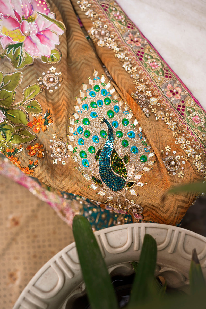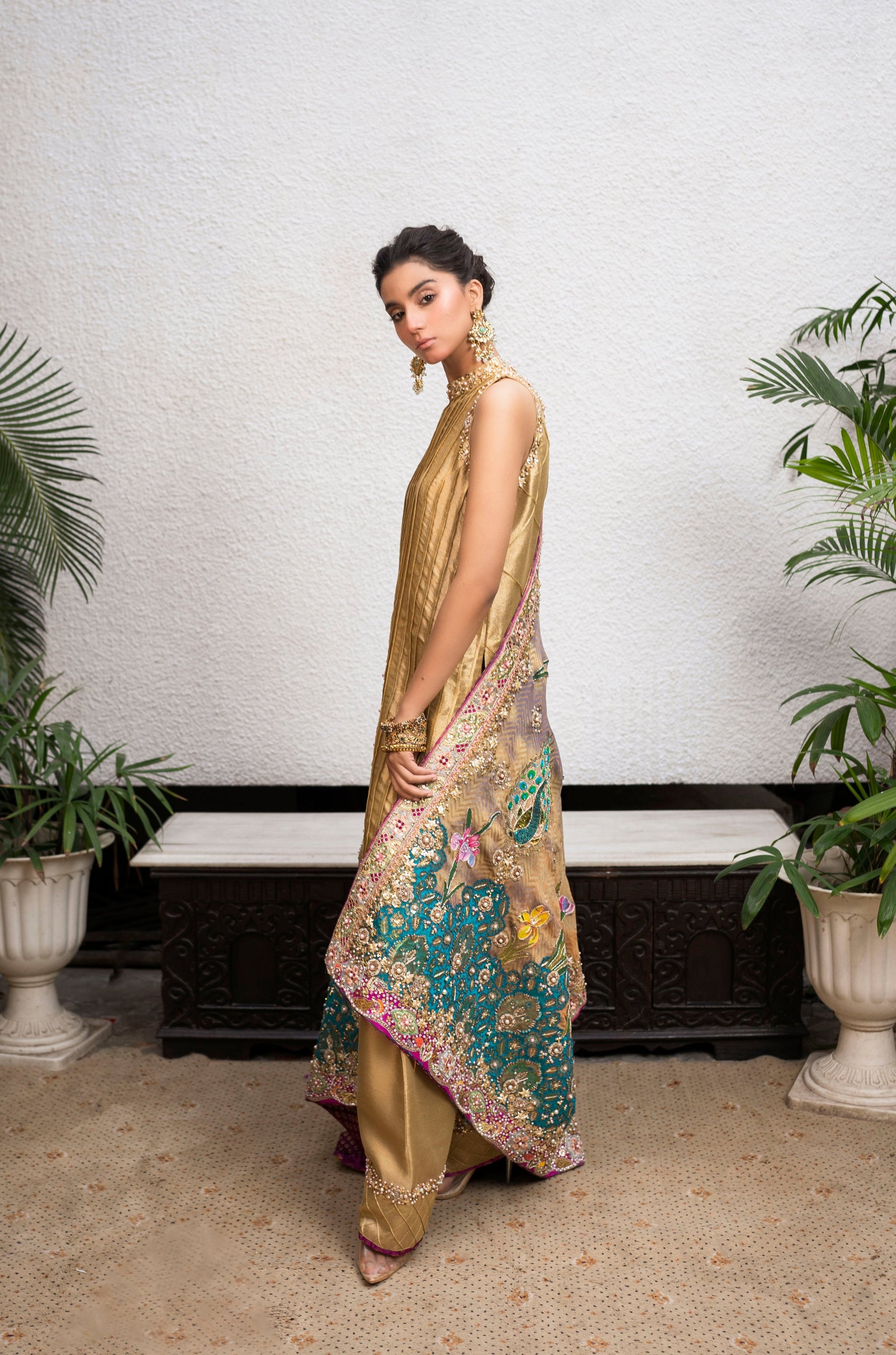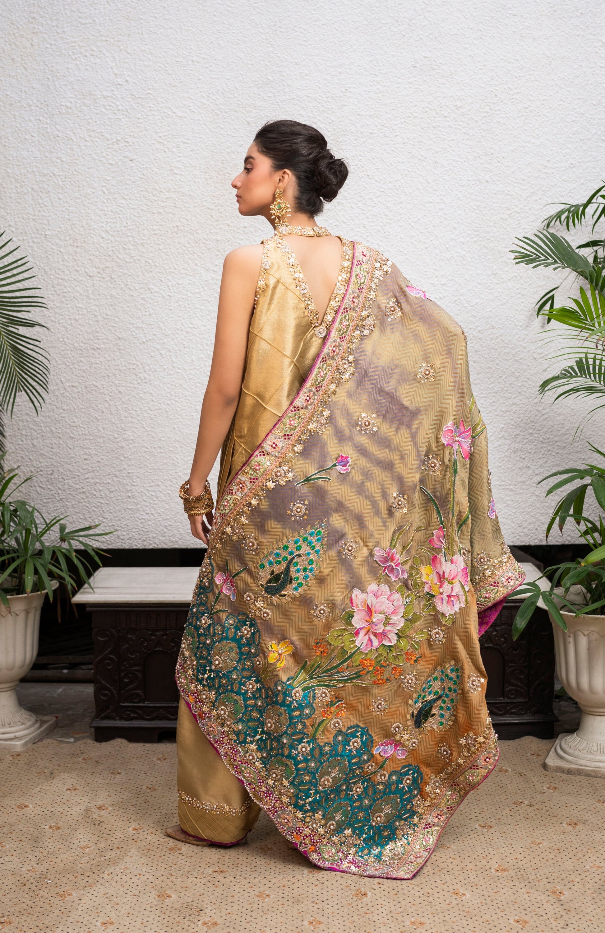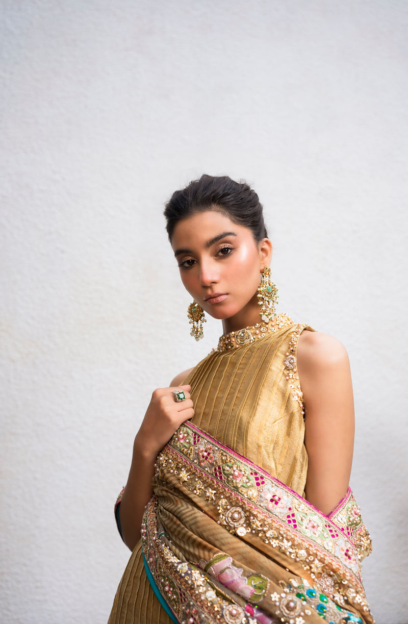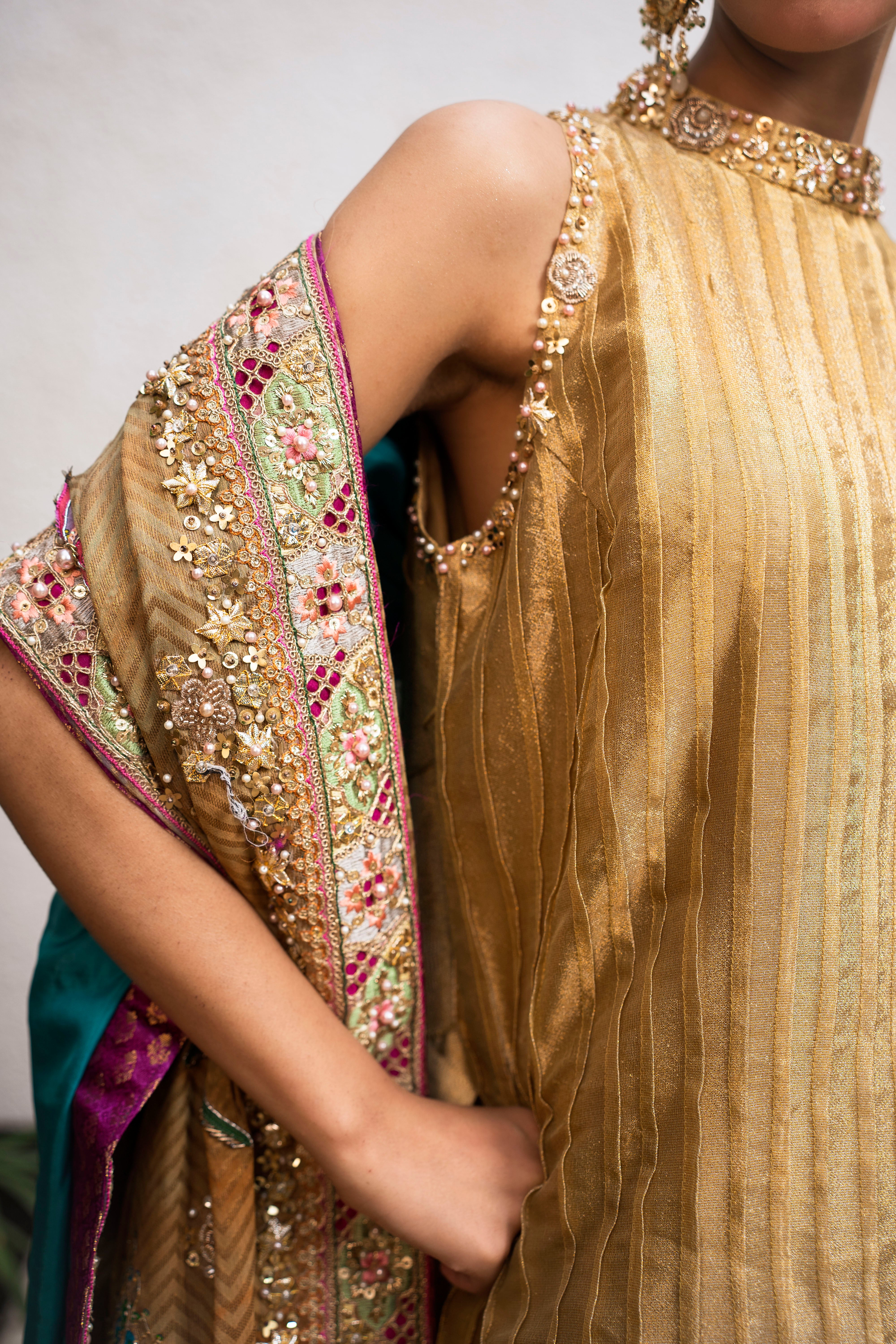 The combination of the shimmering gold tissue, delicate beadwork, and vibrant chaddar appliqué creates a look that is both regal and contemporary, making it ideal for special celebrations and occasions.
