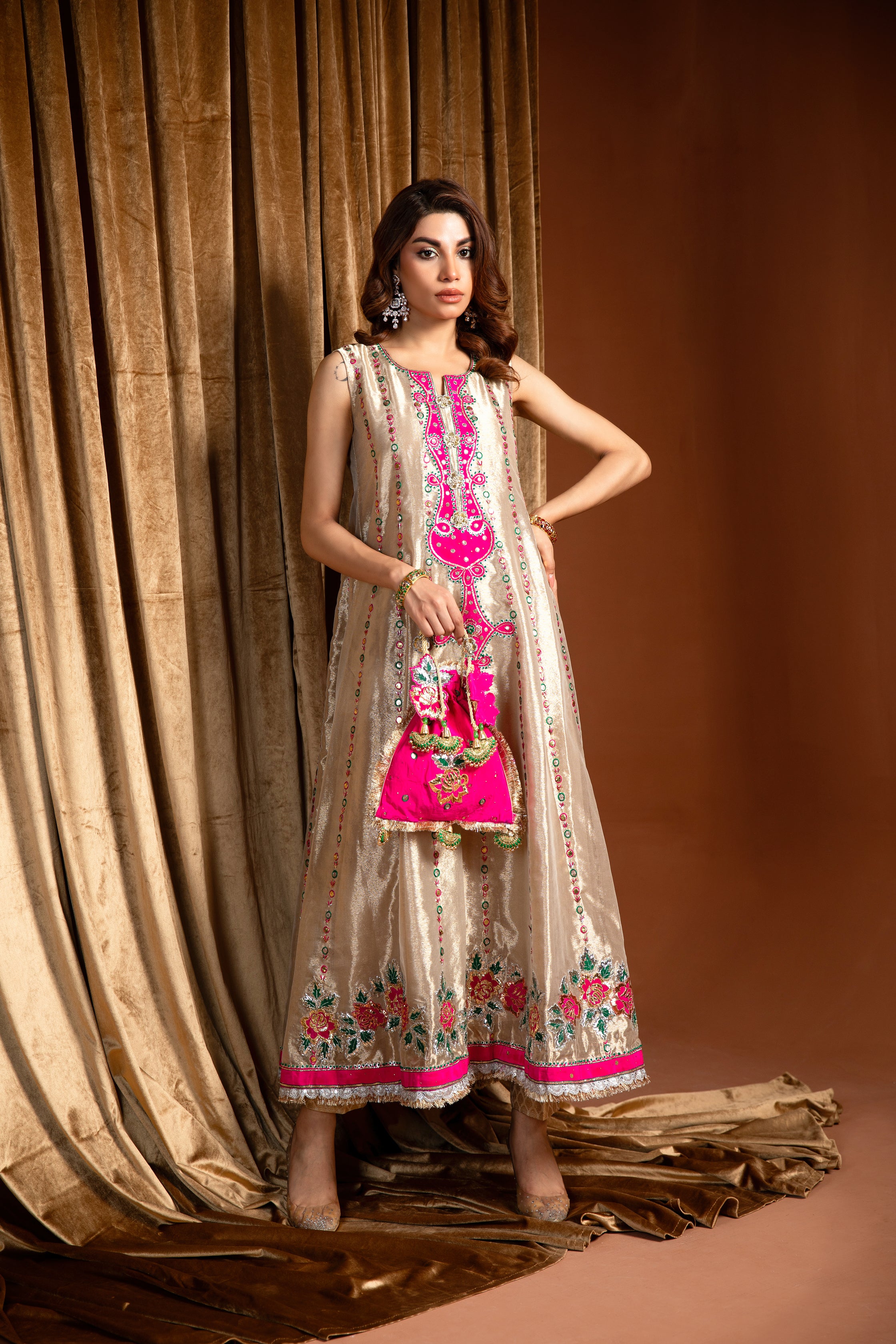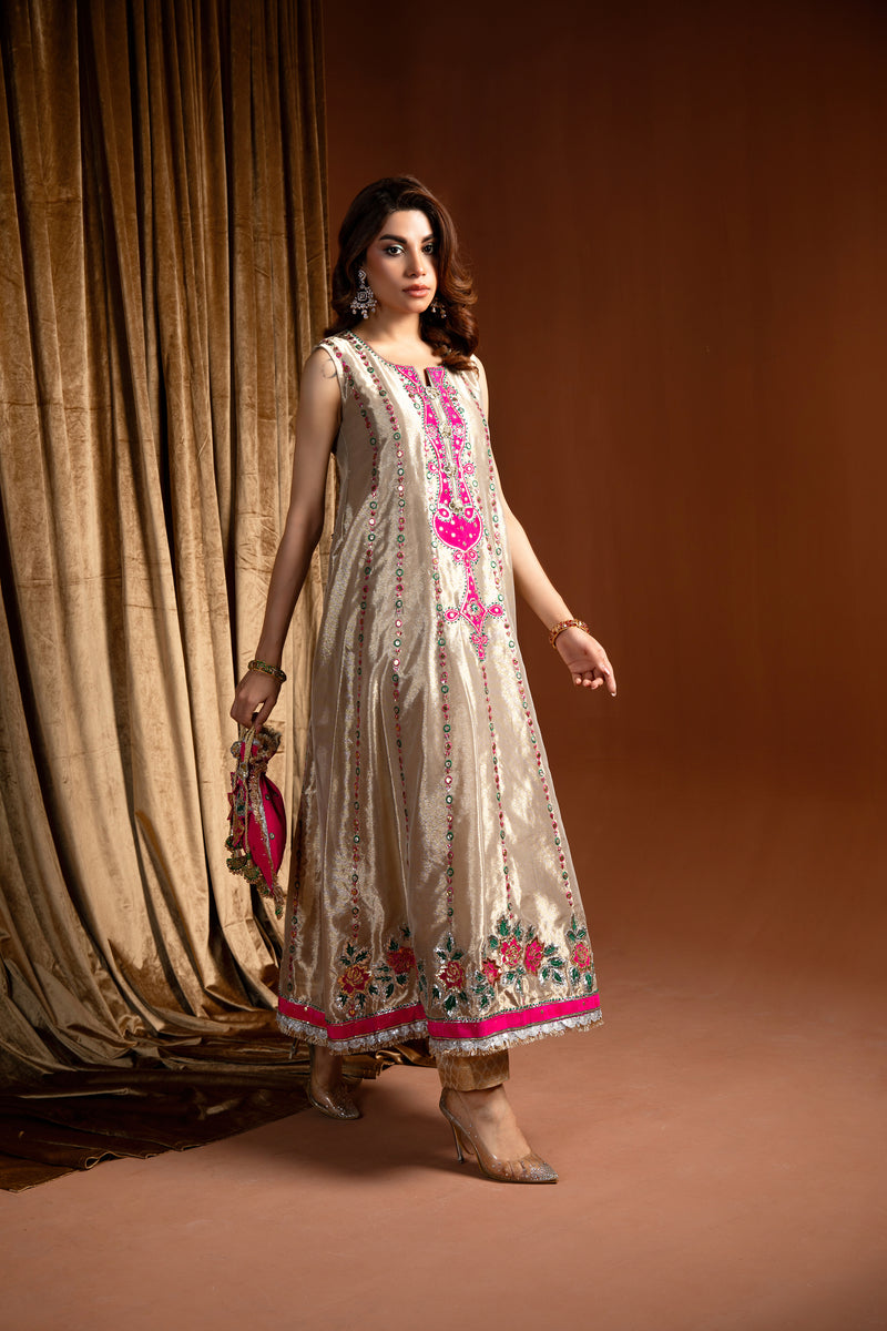 The shirt’s ghira (lower hem) is adorned with a stunning array of floral roses, hand-embroidered in rich colors that stand out against the golden tissue fabric. To further accentuate the look, the shirt is finished with shocking silk borders, which provide a striking contrast to the gold tissue and create a vibrant, eye-catching detail that enhances the overall elegance of the outfit.