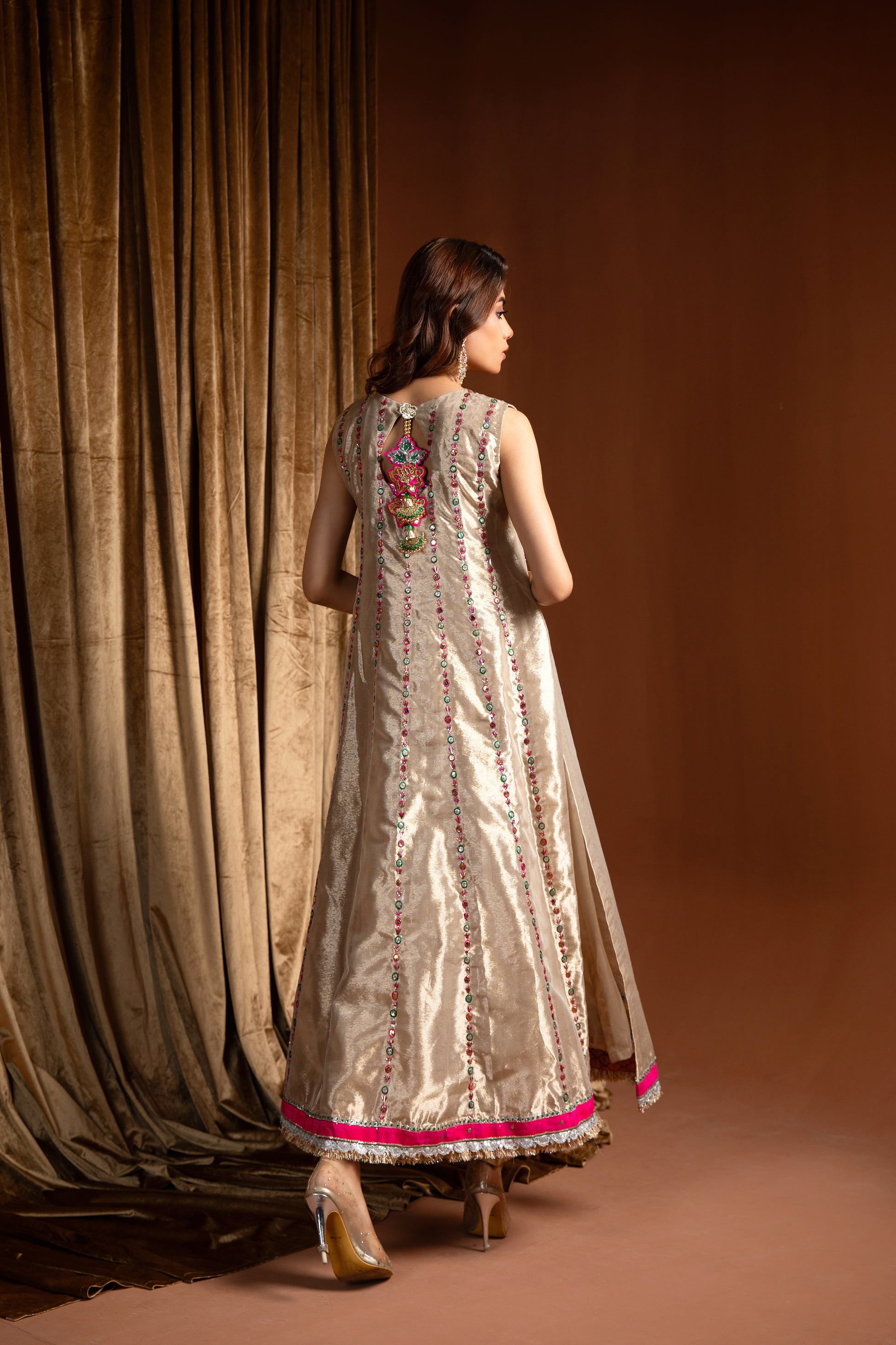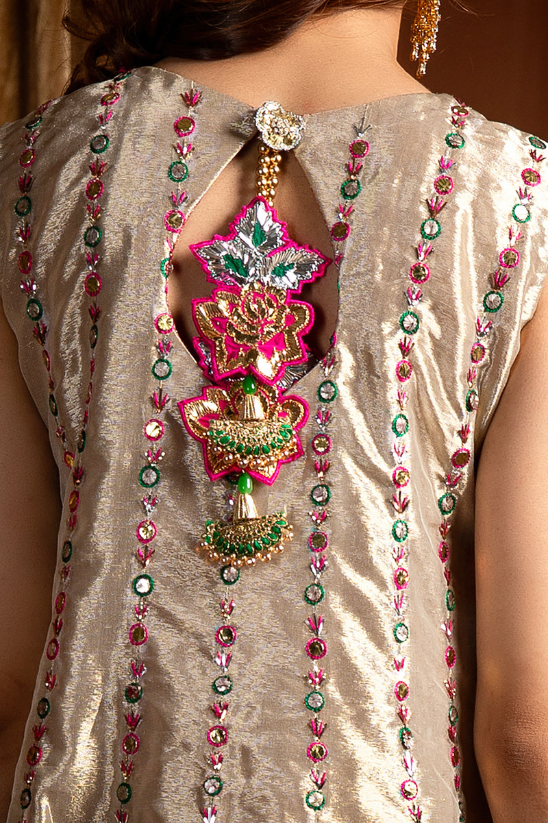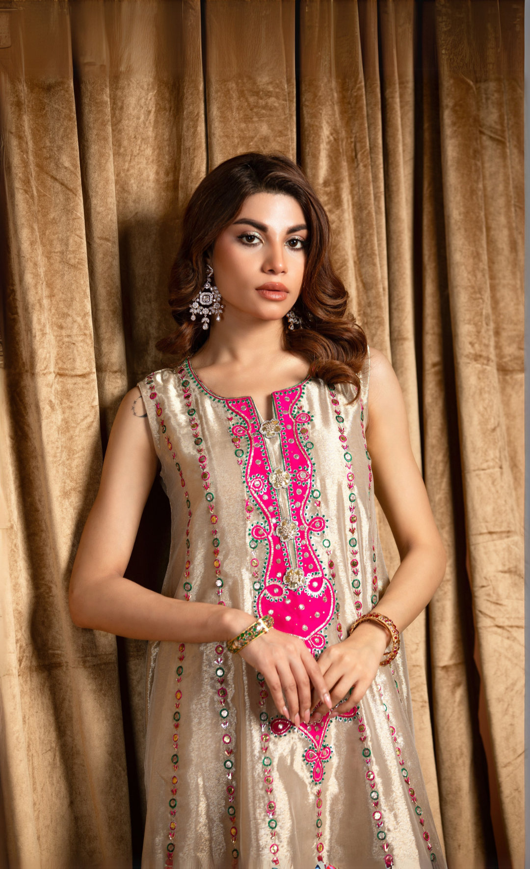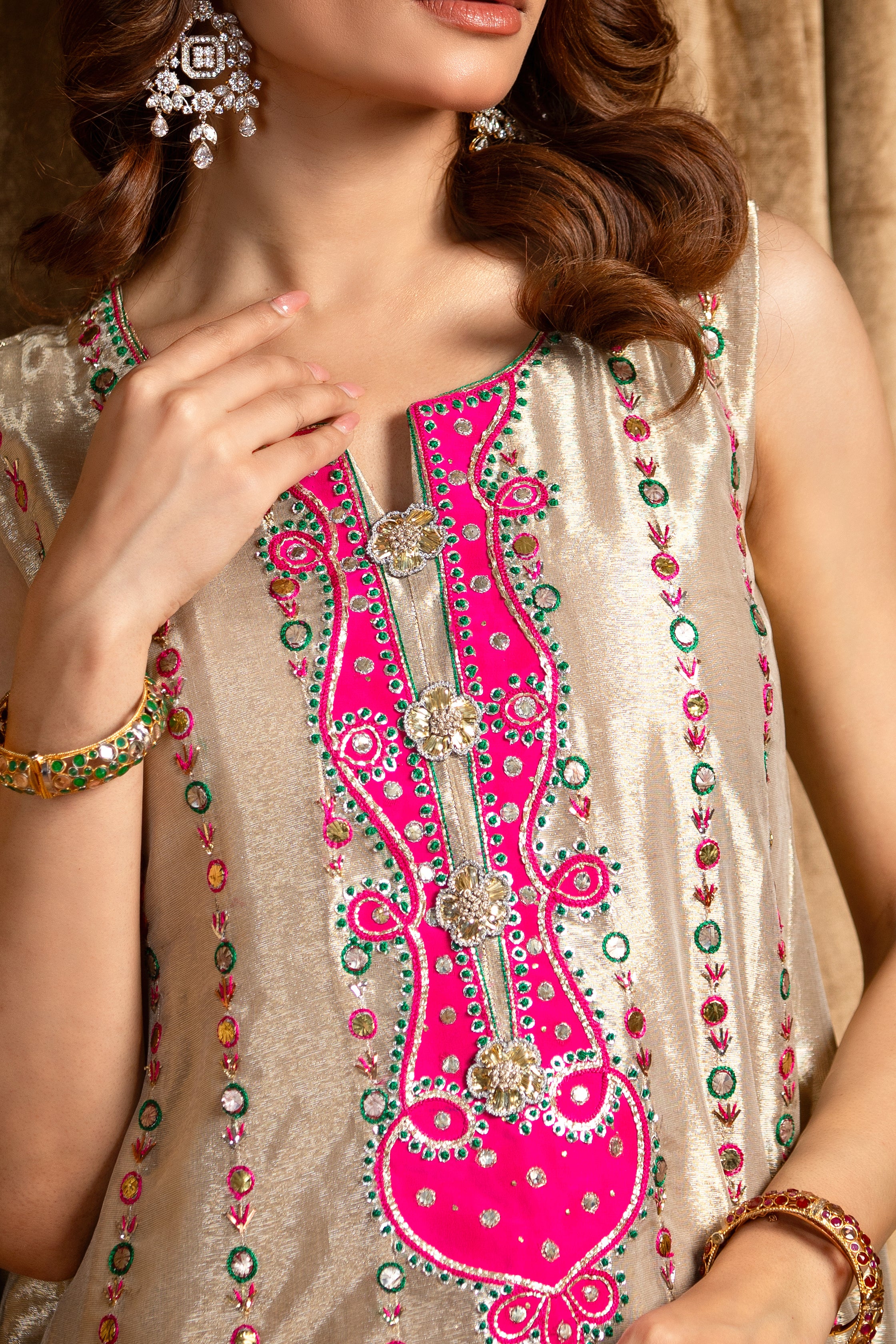 This luxurious gold tissue shirt is a true masterpiece of craftsmanship, designed to make a bold yet elegant statement. The shirt features multiple panels, each one intricately worked with exquisite Gota and Dapka embroidery. The panels are meticulously arranged, enhancing the overall flow and structure of the shirt, making it a perfect choice for festive occasions or formal events.