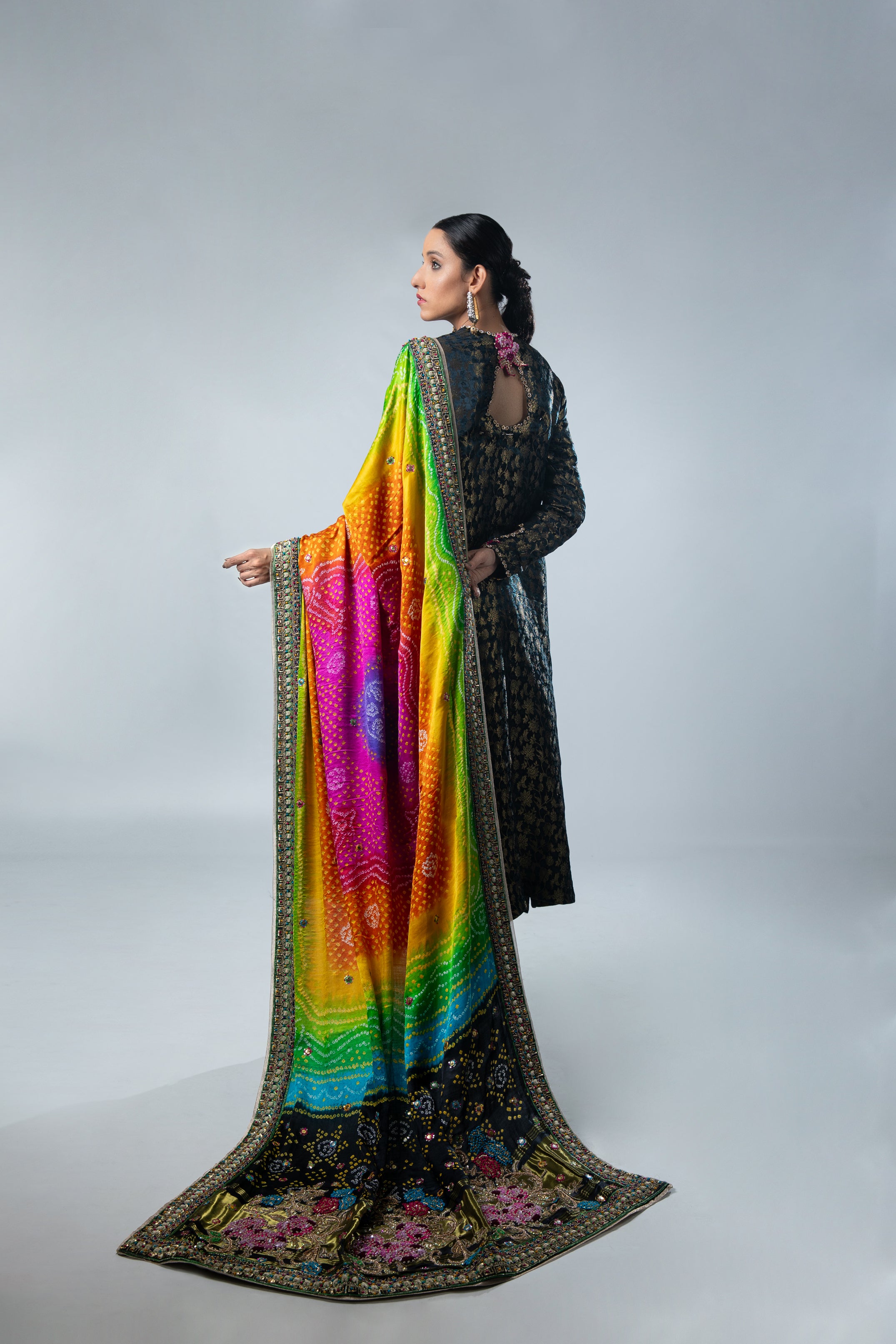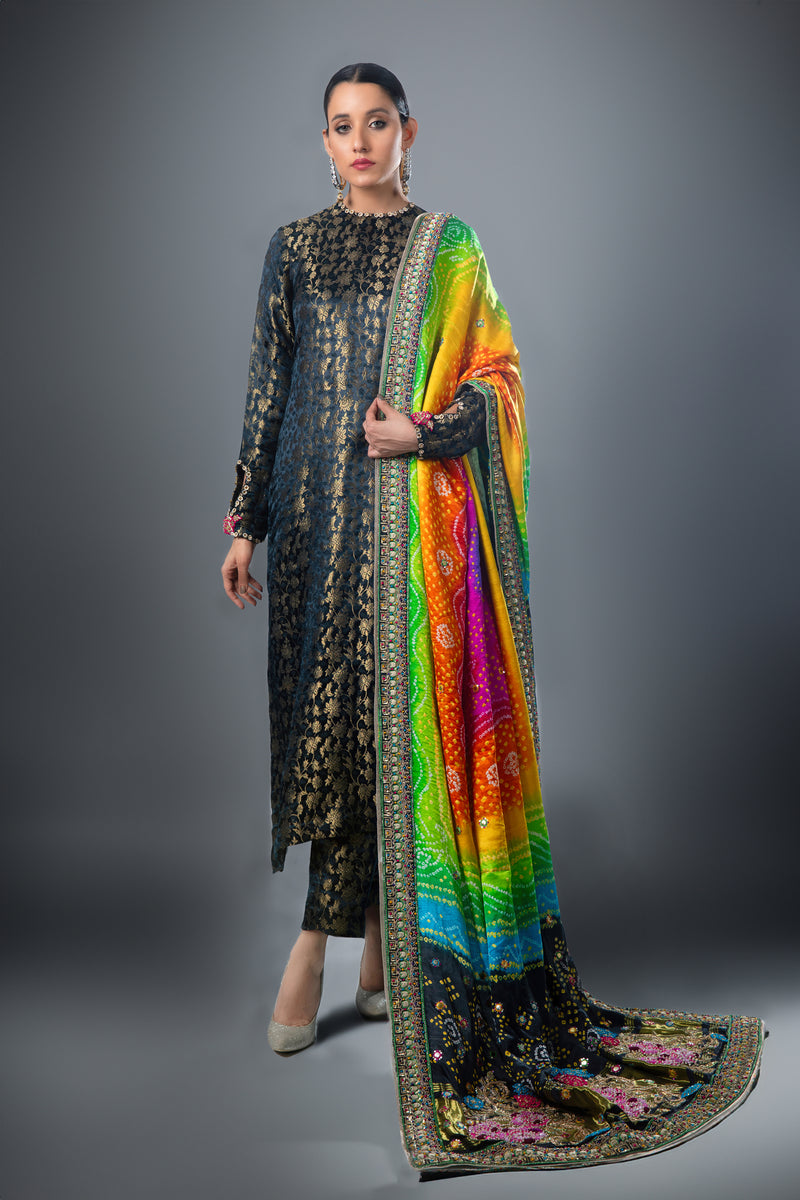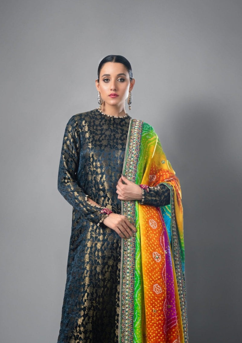 This striking black Jamawar suit exudes timeless elegance, featuring intricate handwork on the churi chaddar that adds a layer of luxurious detail.