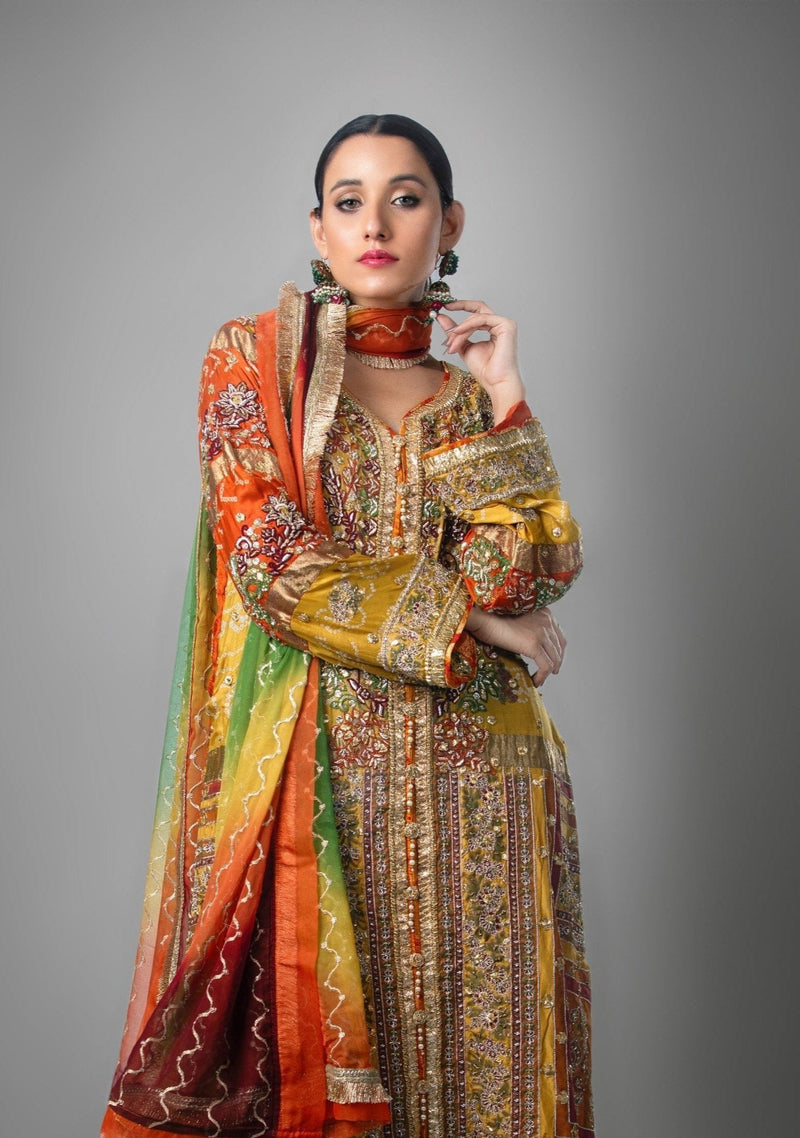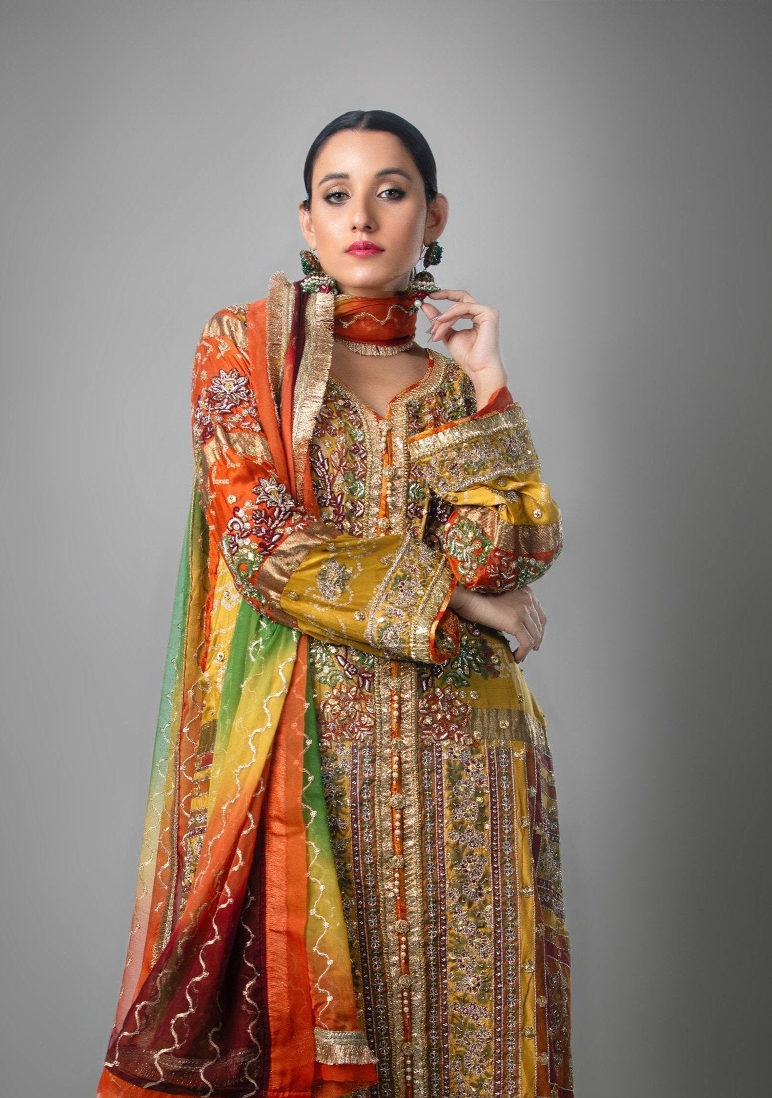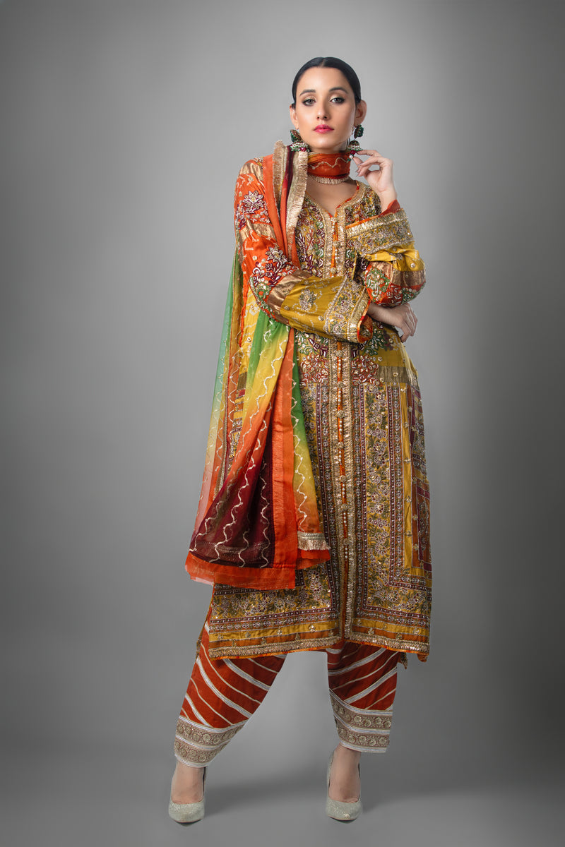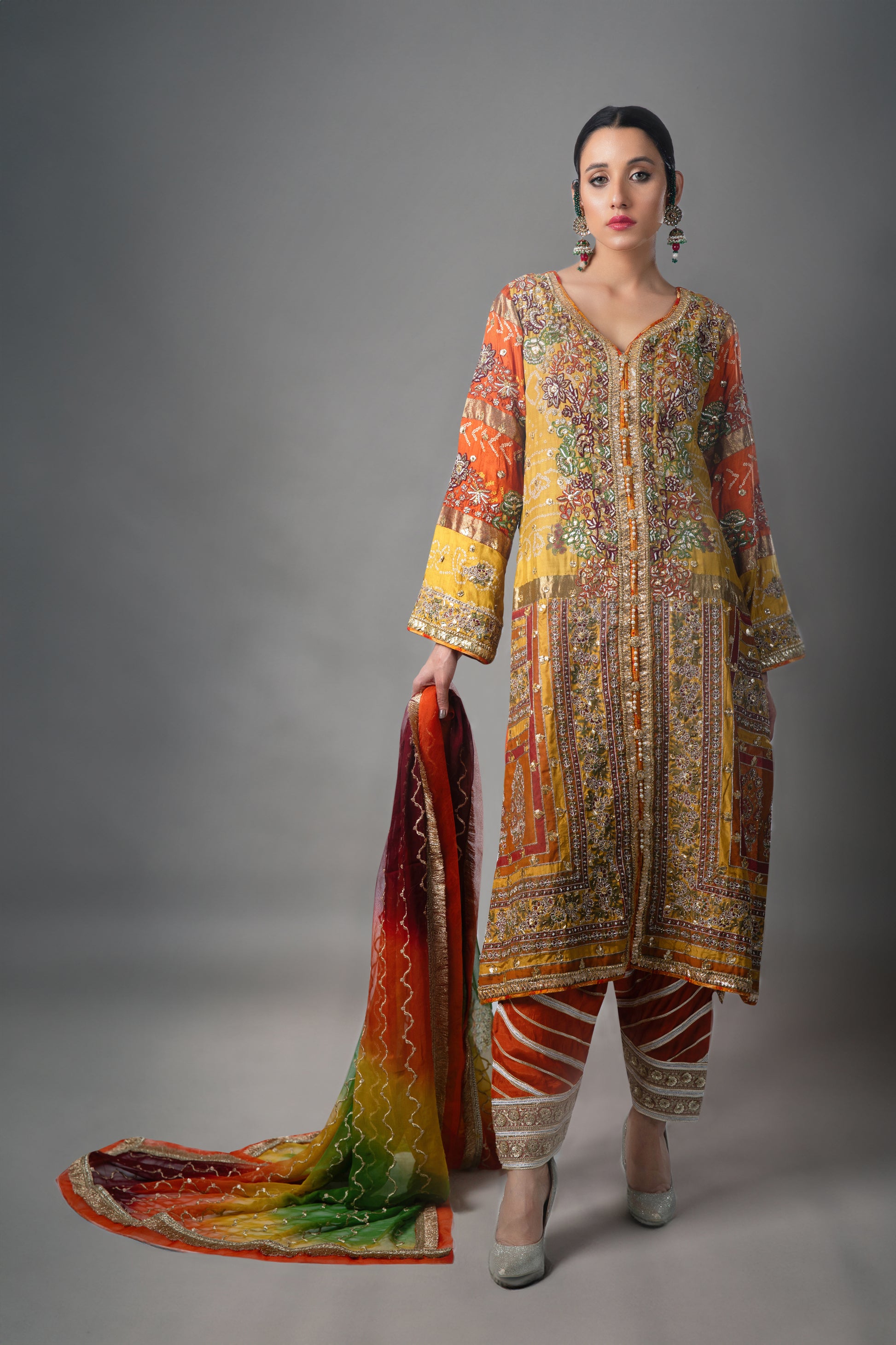 This vibrant ensemble features an orange and mustard yellow block print front-open shirt, intricately embellished with exquisite Gota work, which adds a touch of glamour to the design. The shirt is paired with an orange raw silk shalwar, adorned with diagonal Gota lines that enhance its texture and movement.