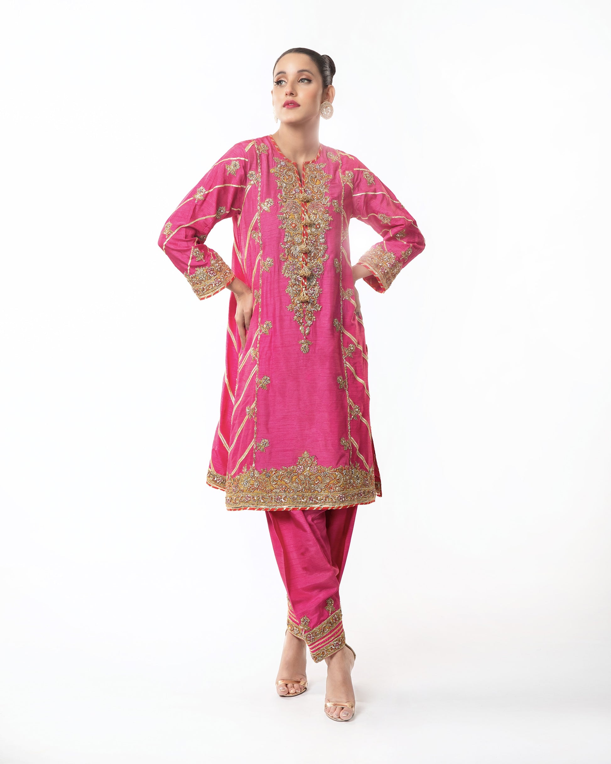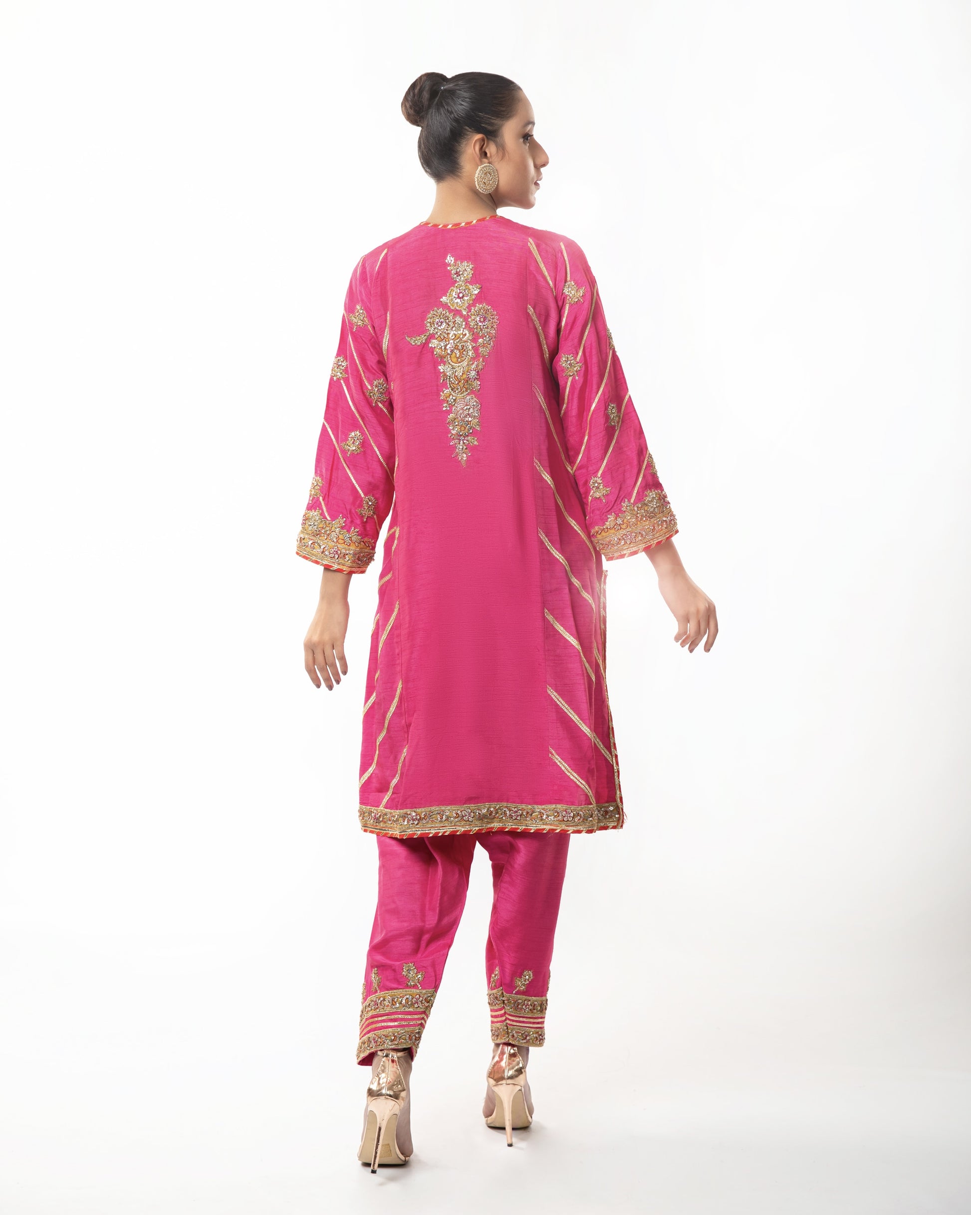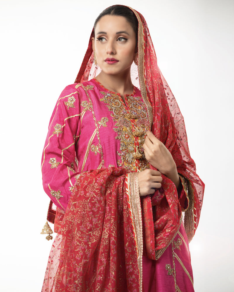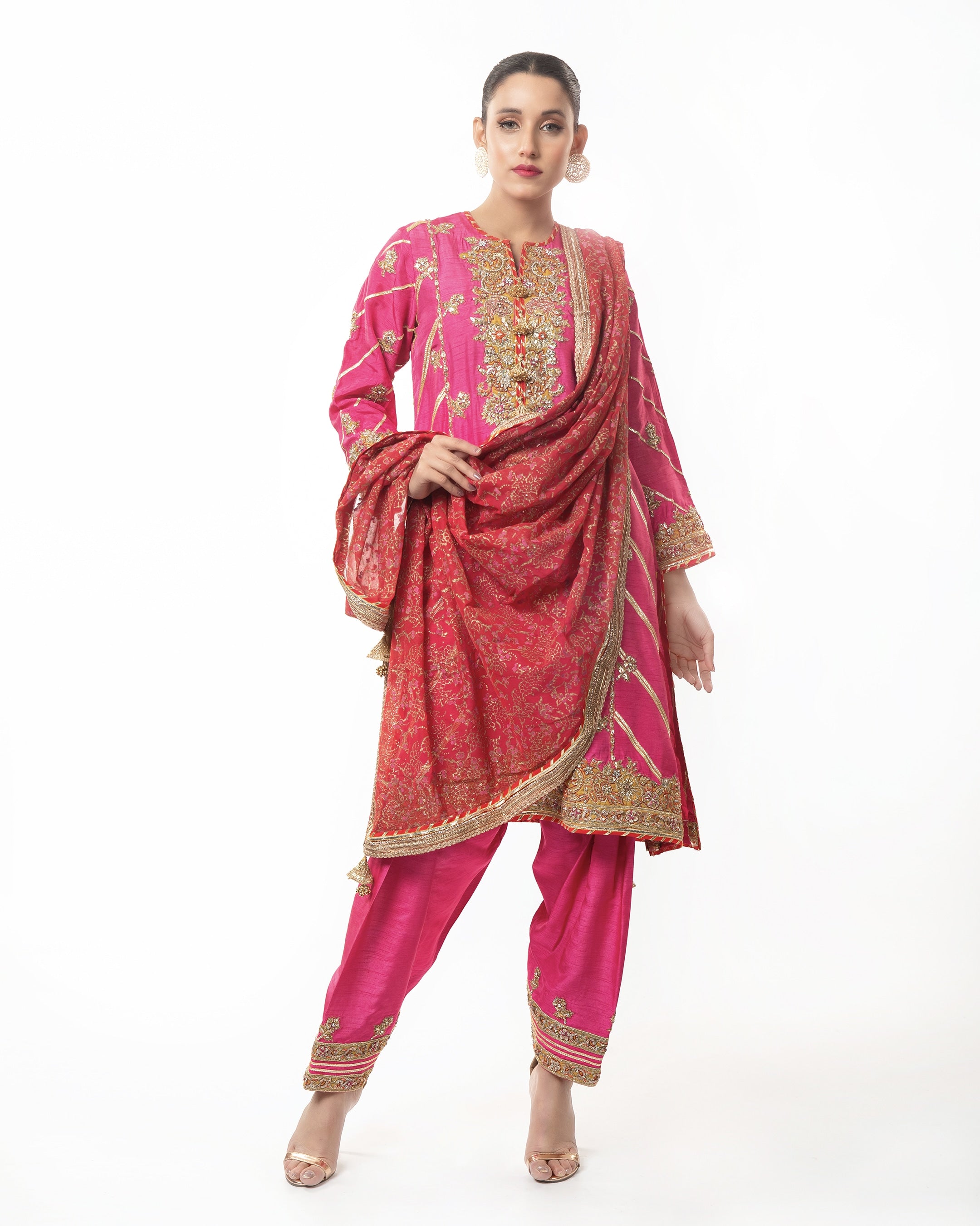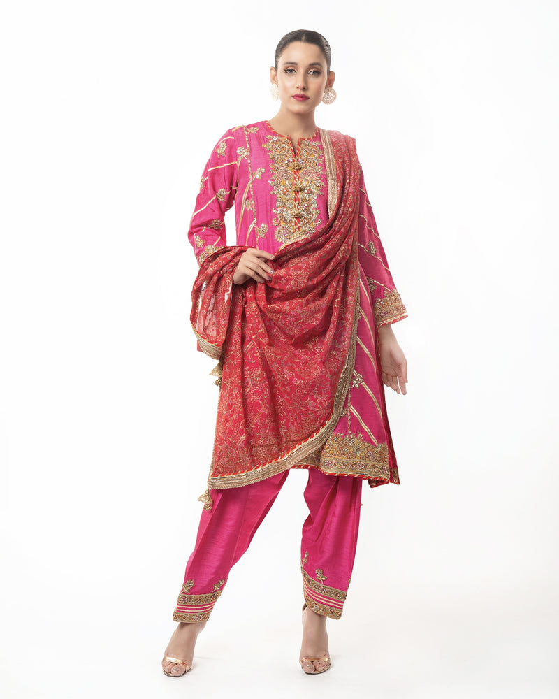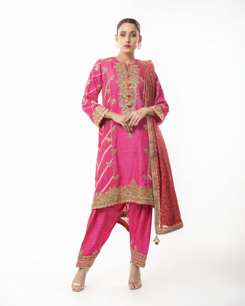 Crafted from the timeless shade of pink, the "Rosy Radiance" hot pink raw silk outfit exudes bold elegance and grace. The rich fabric, paired with intricate gota and zari work, adds a royal touch, bringing an exquisite blend of tradition and luxury.