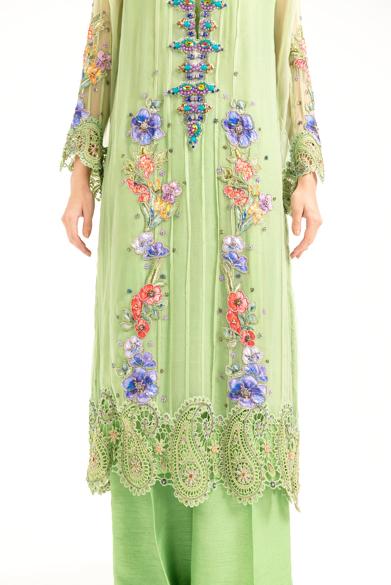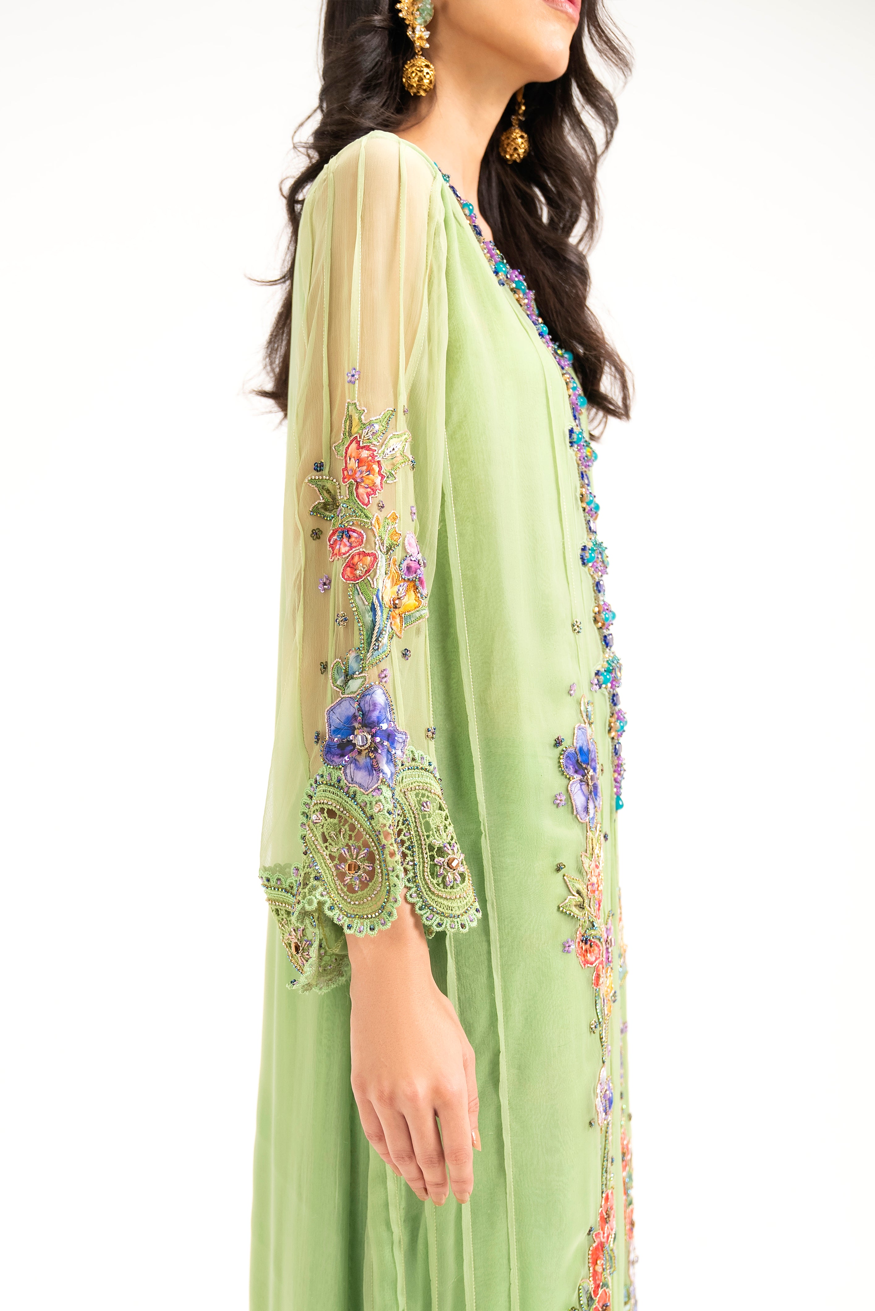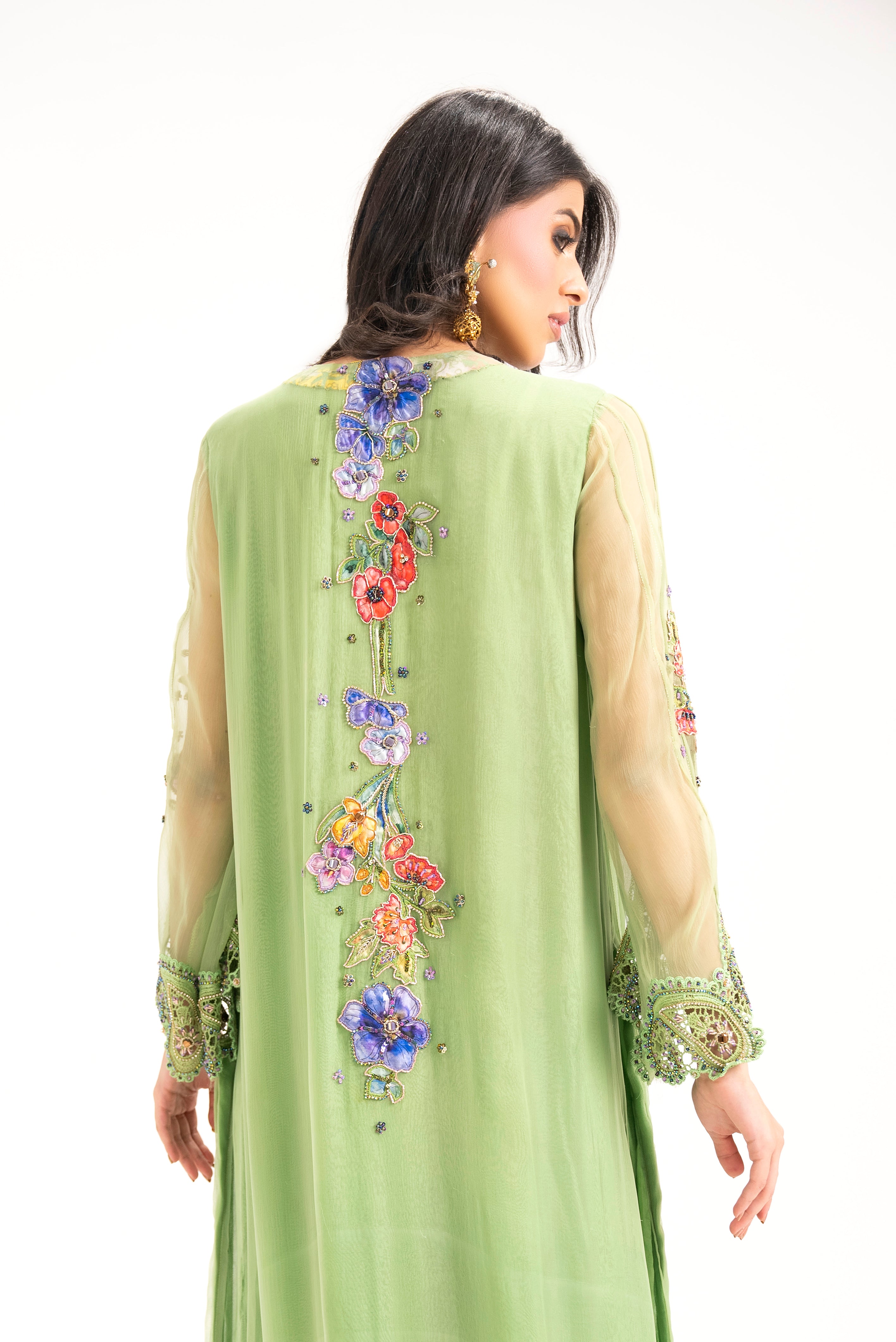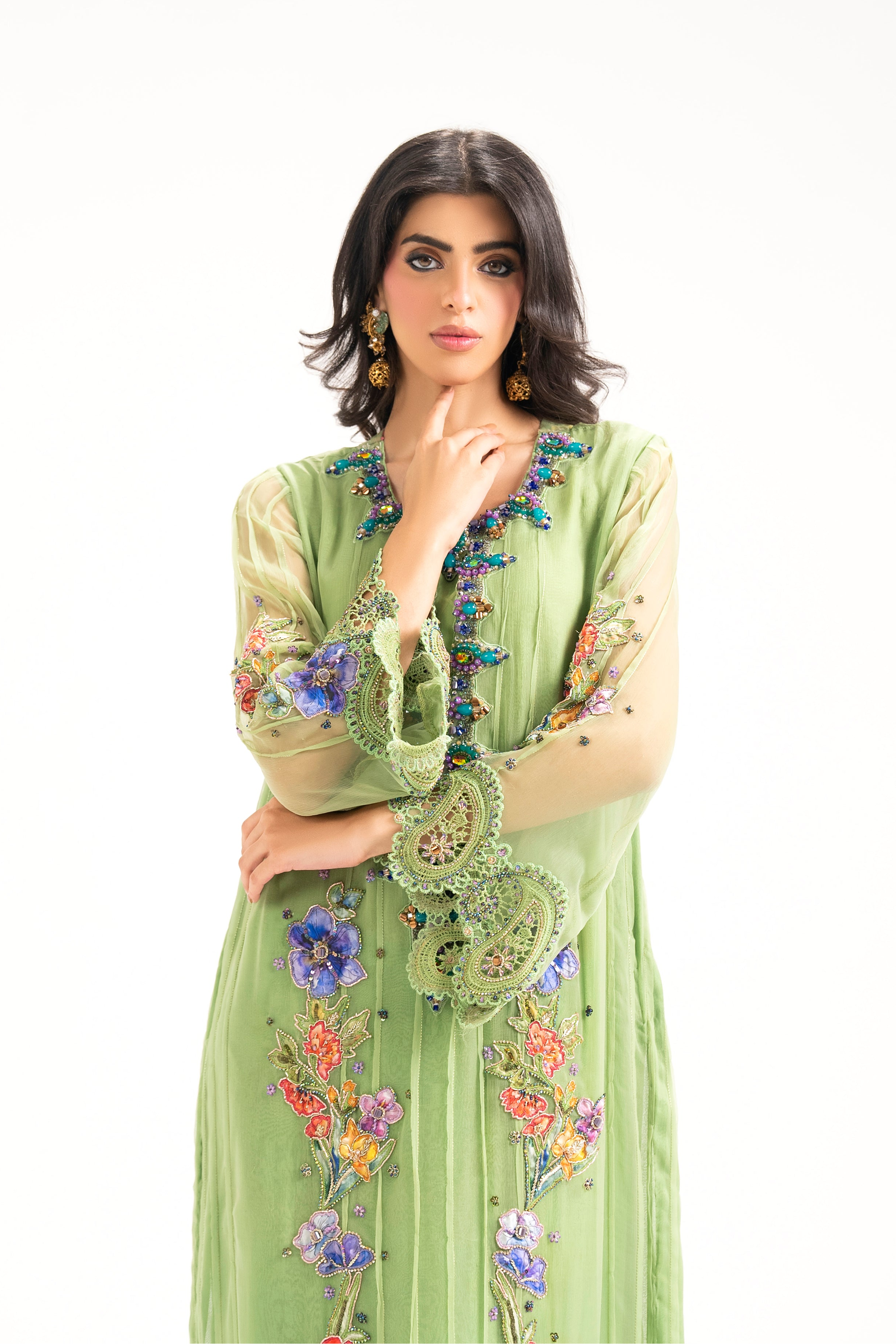 Shirt & Dupatta: Made from premium Pakistani Chiffon, delicately hand-embellished to perfection