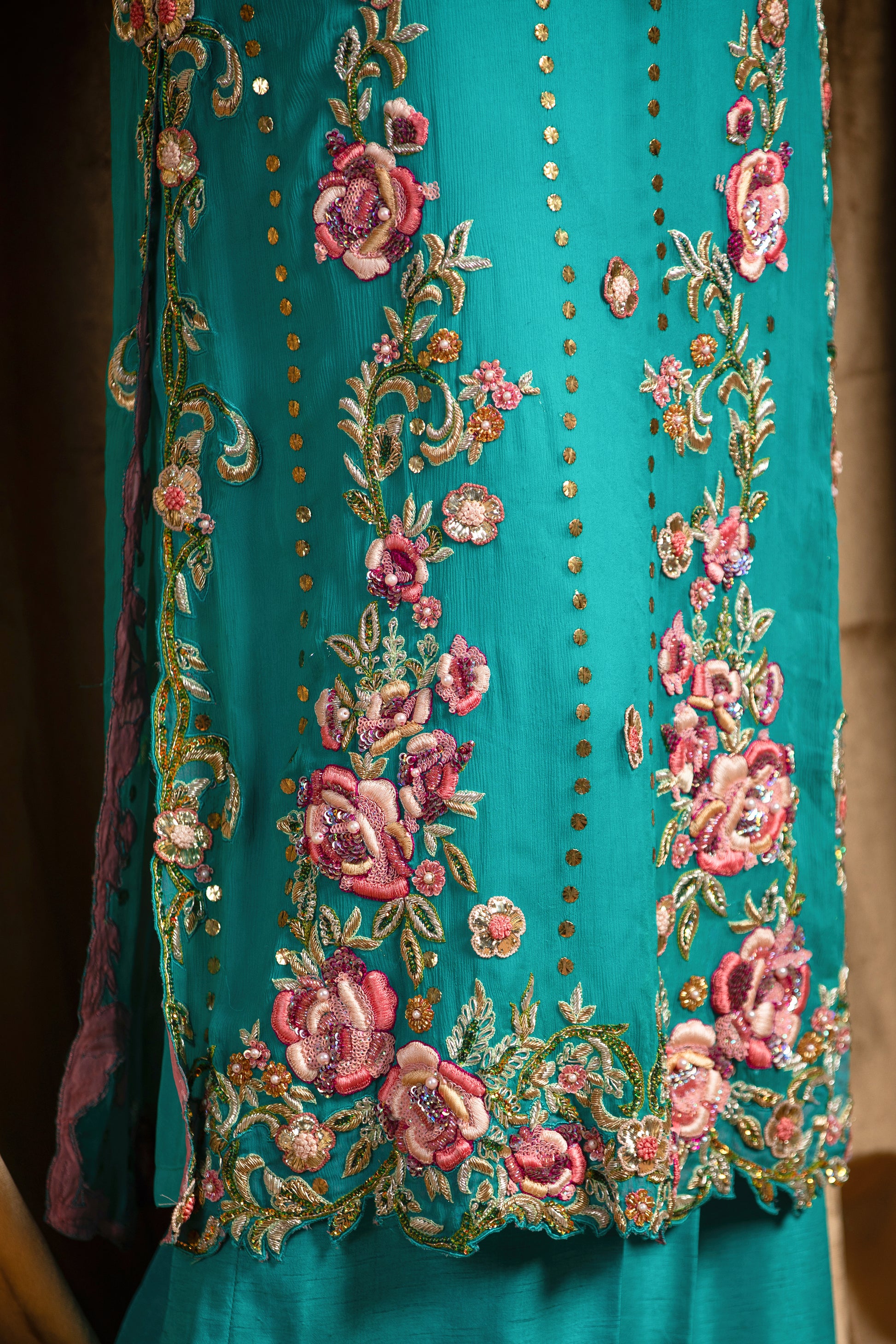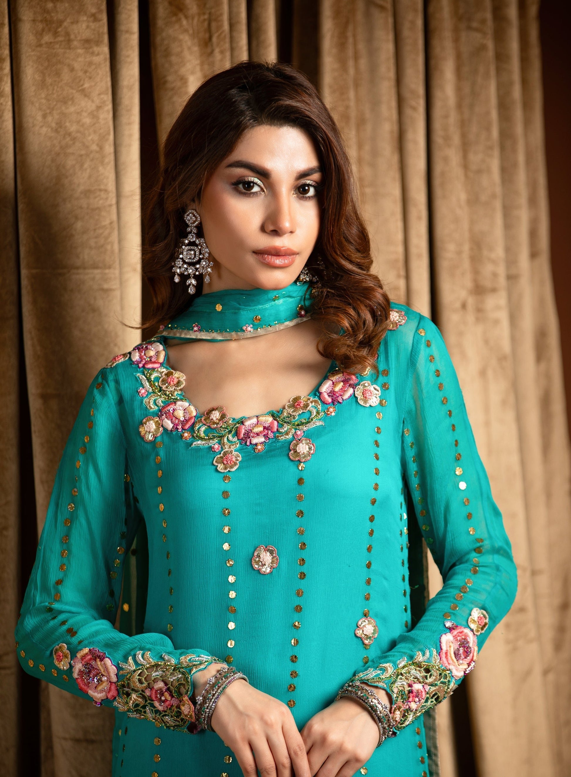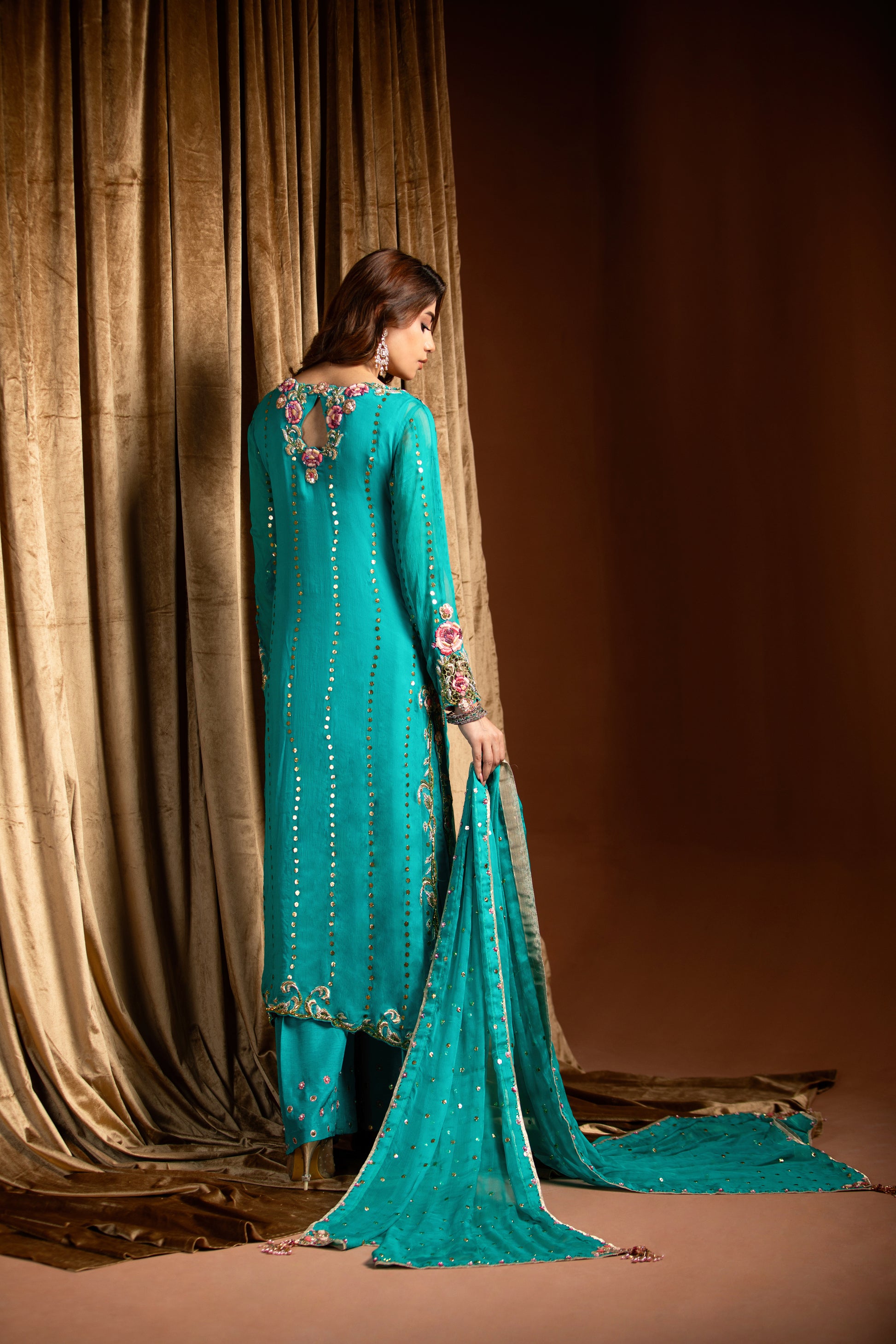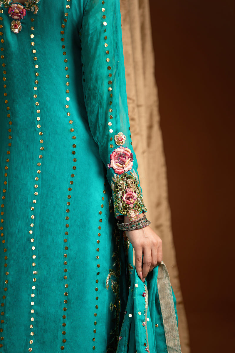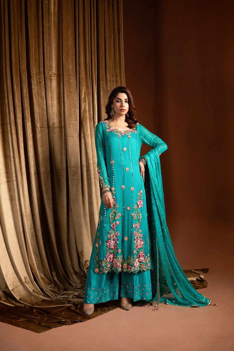 This exquisite turquoise Mukesh chiffon shirt is a true vision of elegance and intricate craftsmanship. The soft, flowing chiffon fabric has been delicately hand-embroidered with enchanting floral motifs, adding a touch of timeless beauty to the piece.