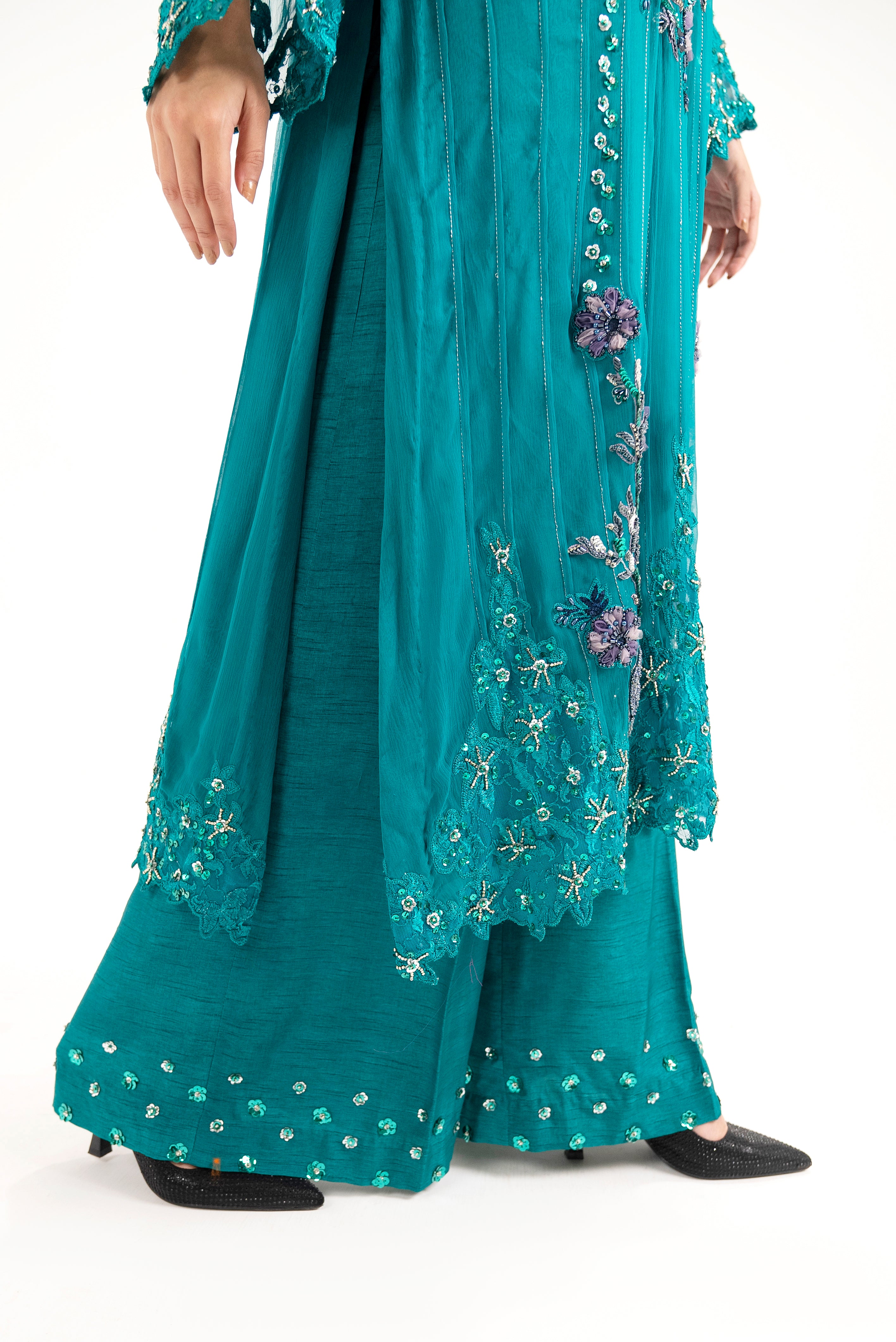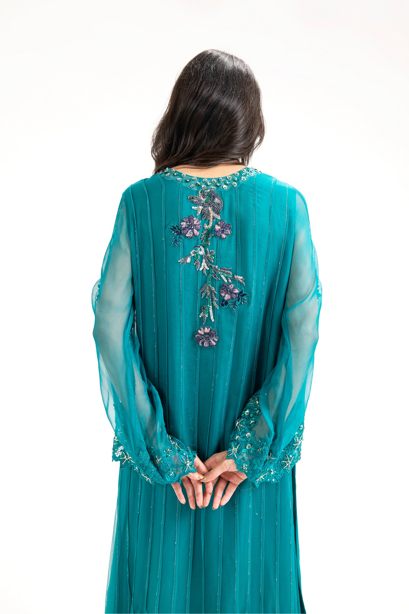 Dusky teal chiffon richly beaded and embroidered to create a soft shimmer effect, ideal for confident, understated glamour.