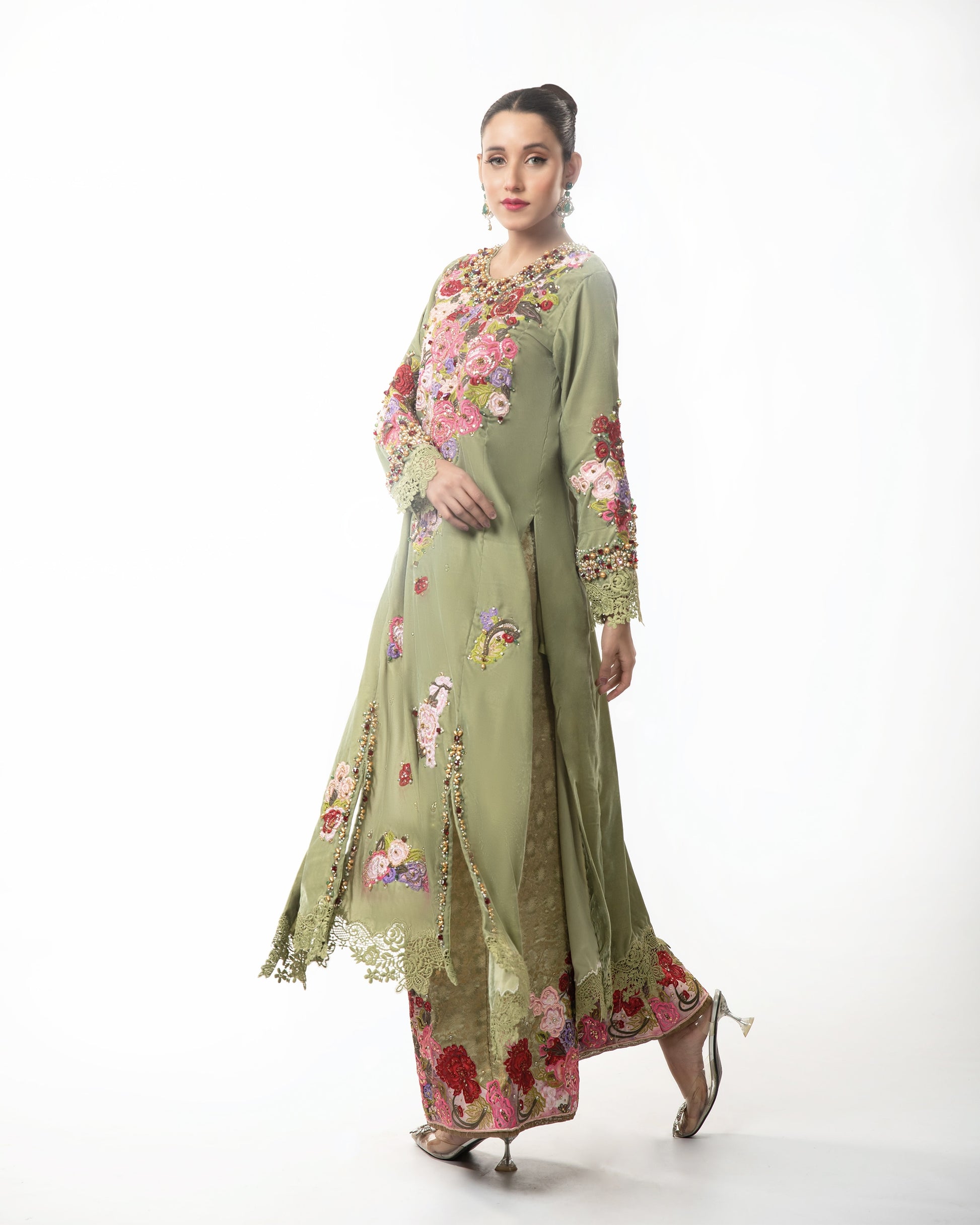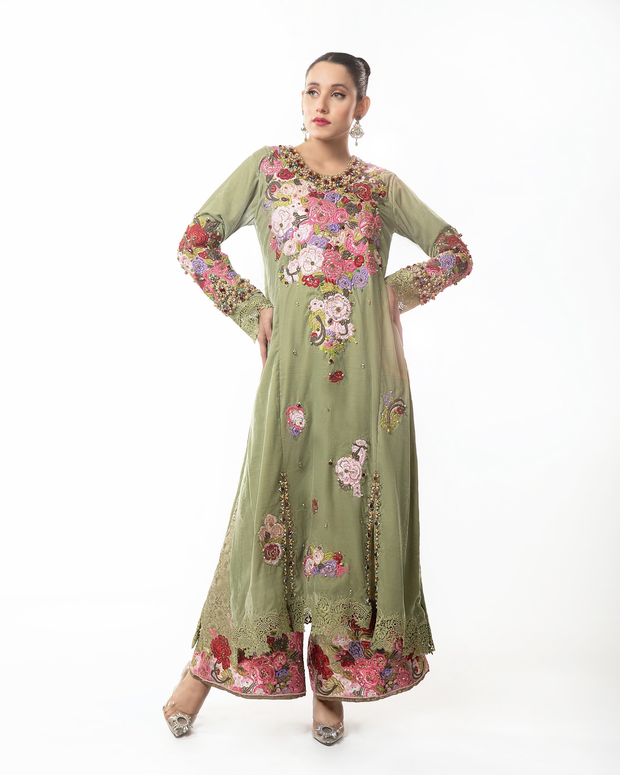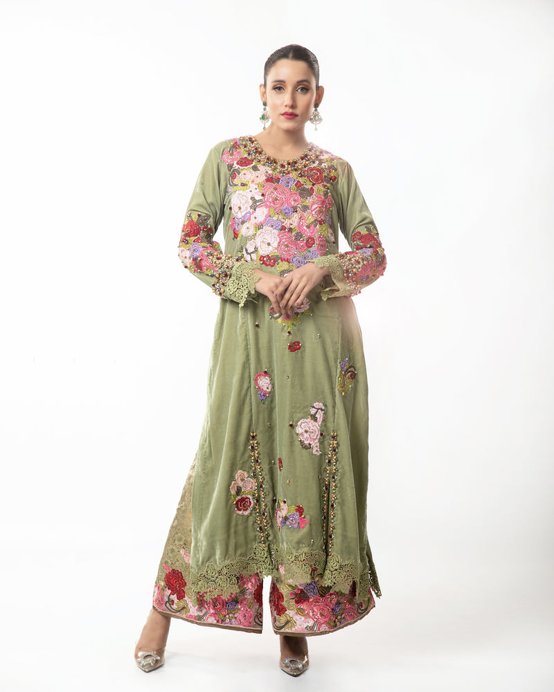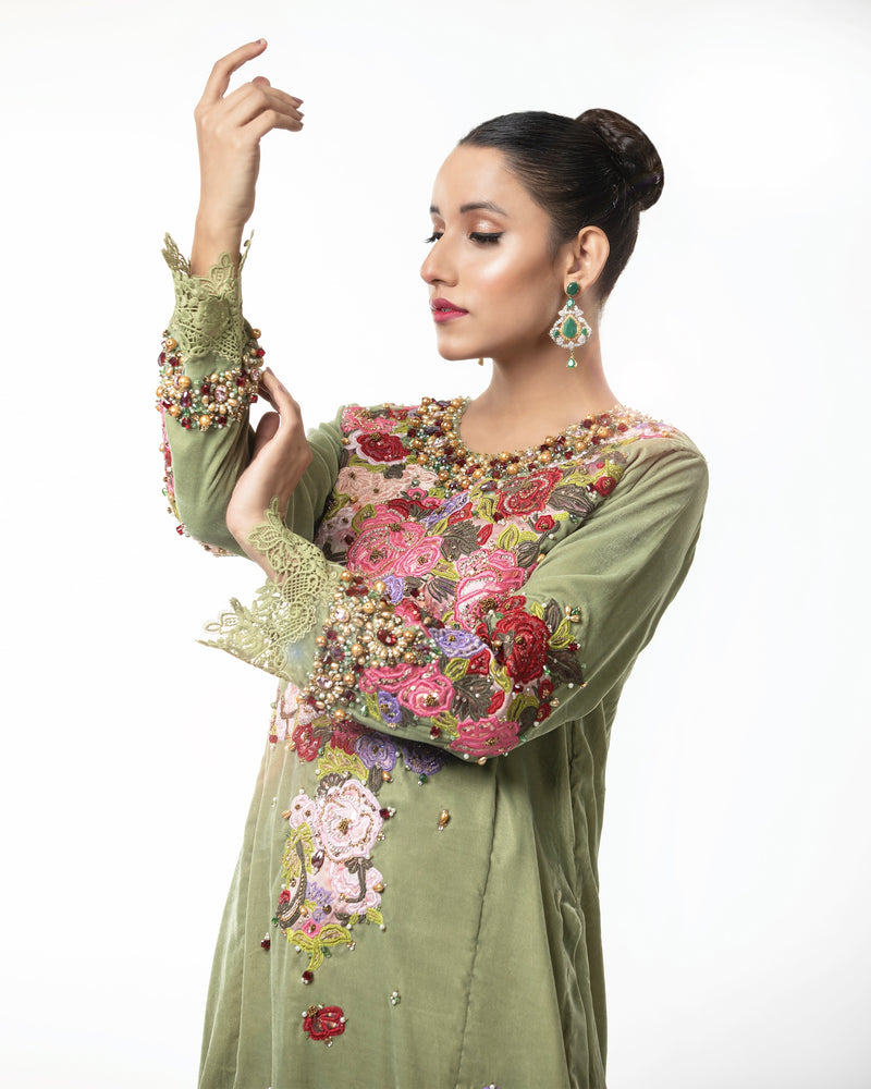 Step into a world of timeless elegance with the "Verdant Bloom" velvet dress. Crafted in luxurious olive green velvet, this dress features delicate floral embroidery that captures the essence of nature's beauty.