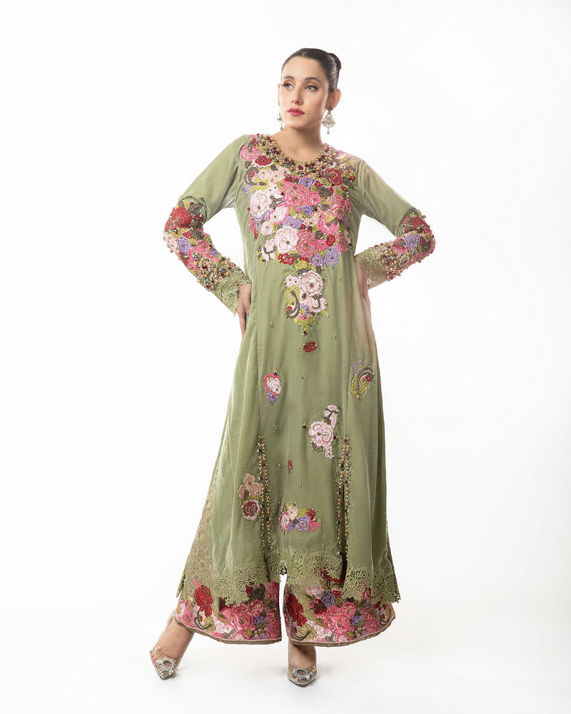 The soft lace accents add a touch of vintage charm, bringing a sense of sophistication to the design. Paired with straight, wide-leg pants for a modern and comfortable silhouette, this outfit is completed with a flowing chiffon dupatta that drapes gracefully.