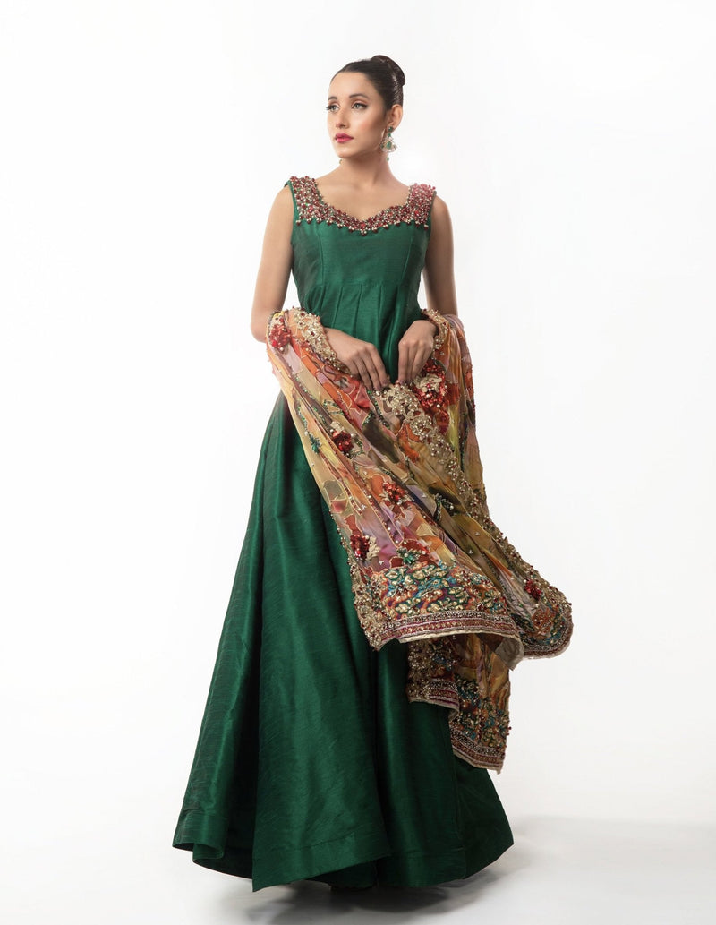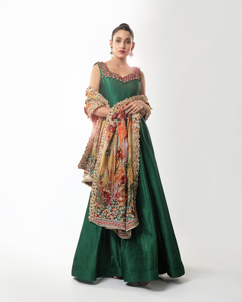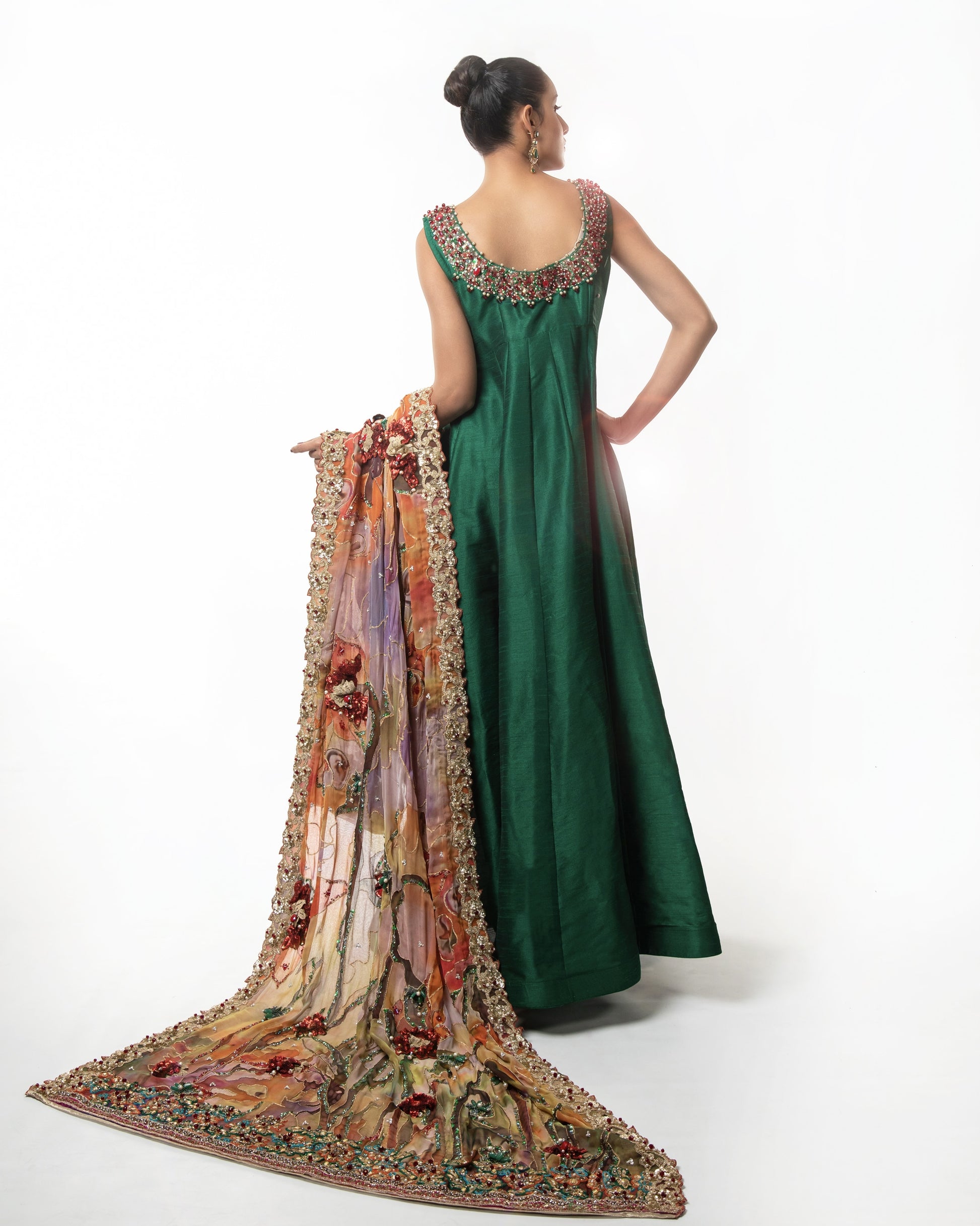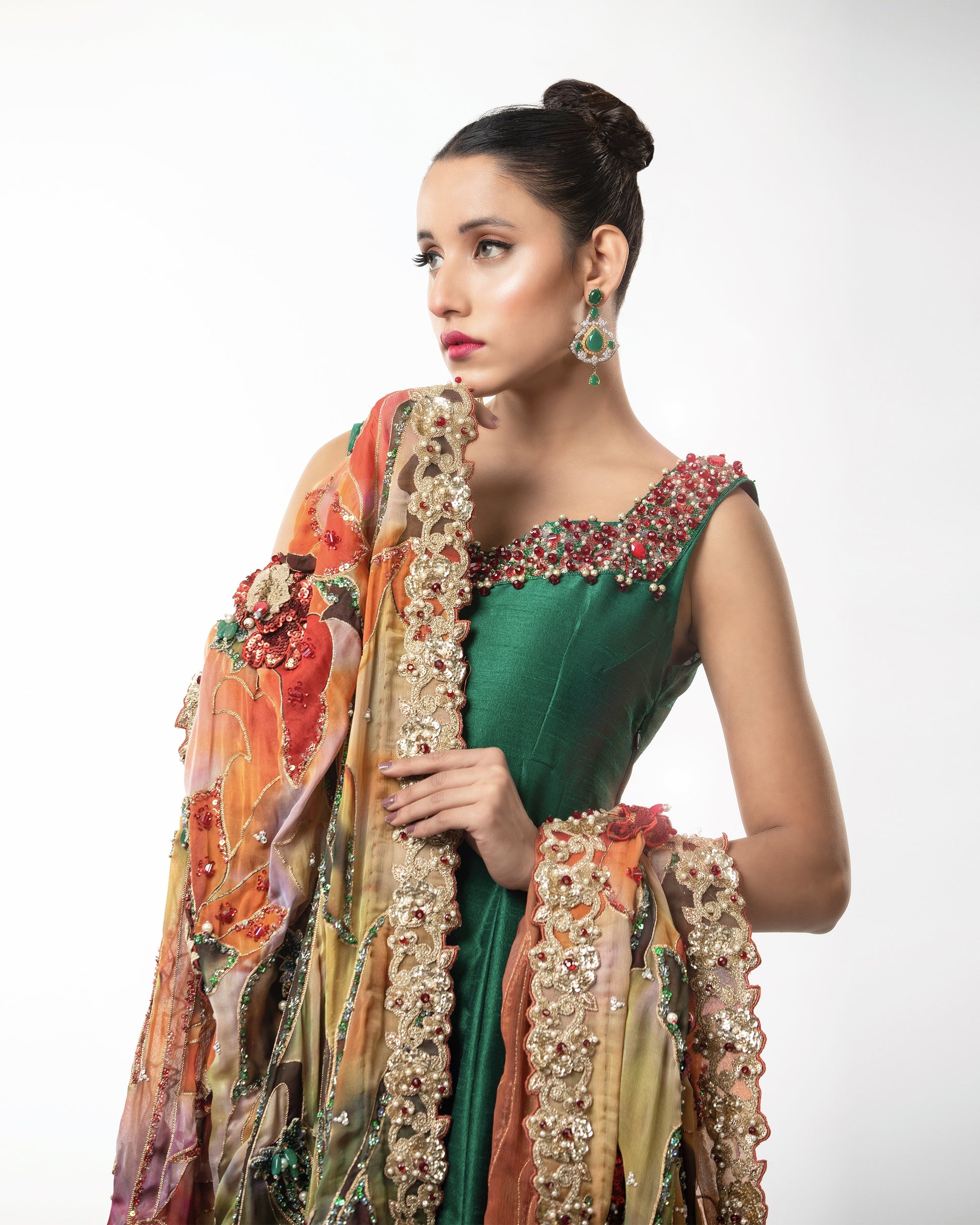 "Verdant Grace" beautifully captures the essence of this exquisite ensemble, drawing inspiration from the deep, lush green of the gown that evokes the vibrancy of nature.
