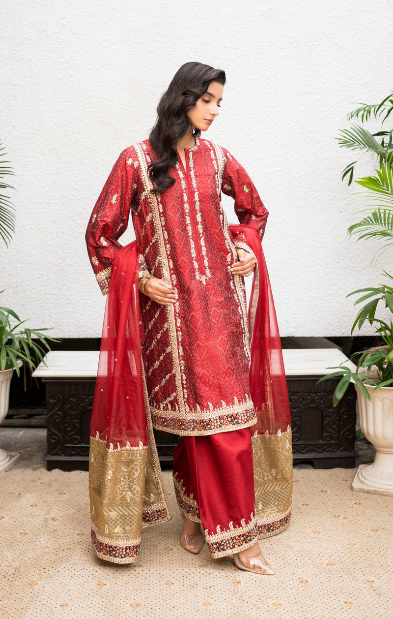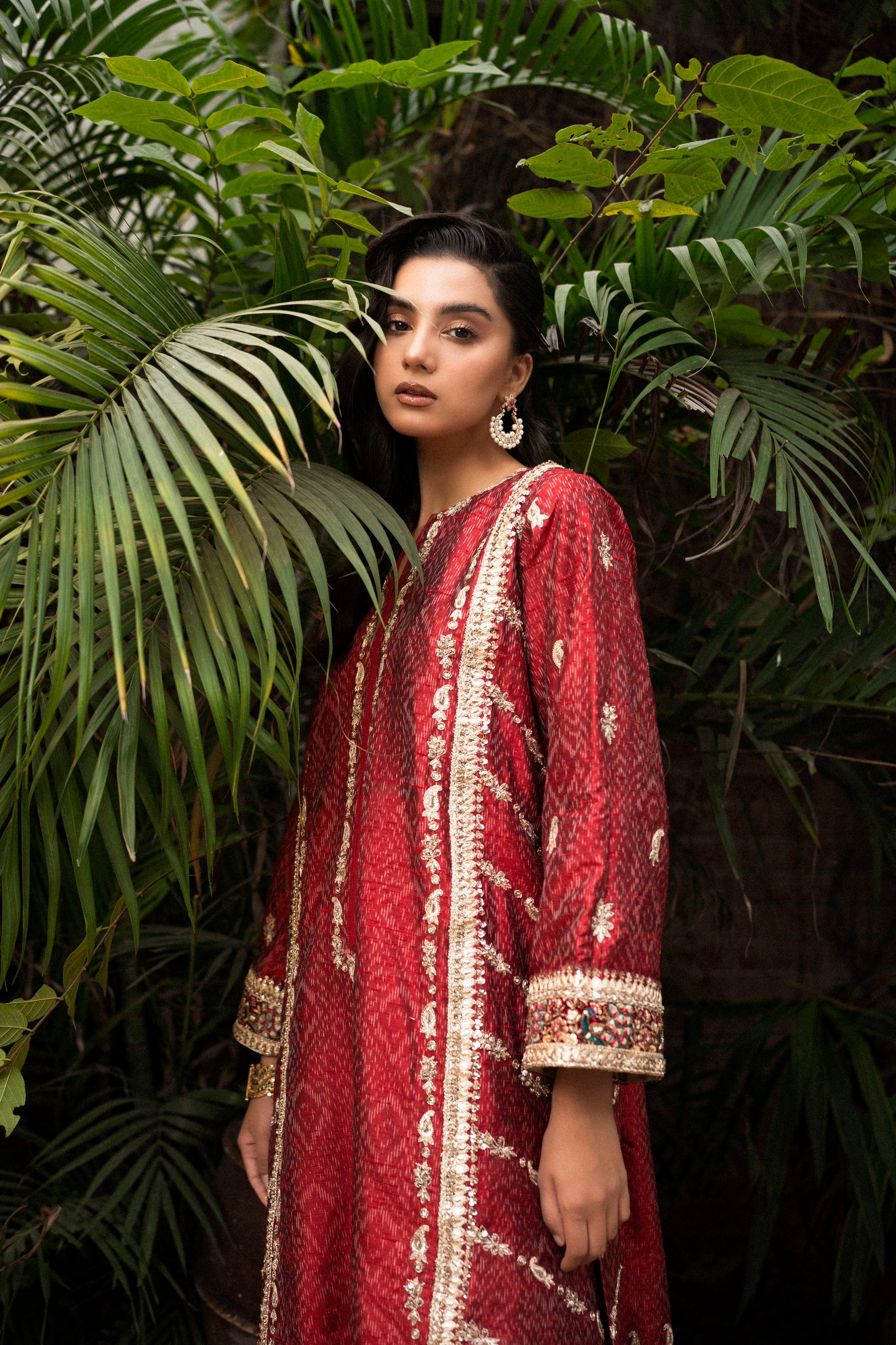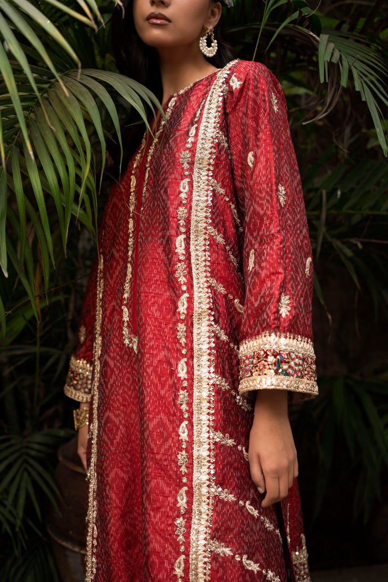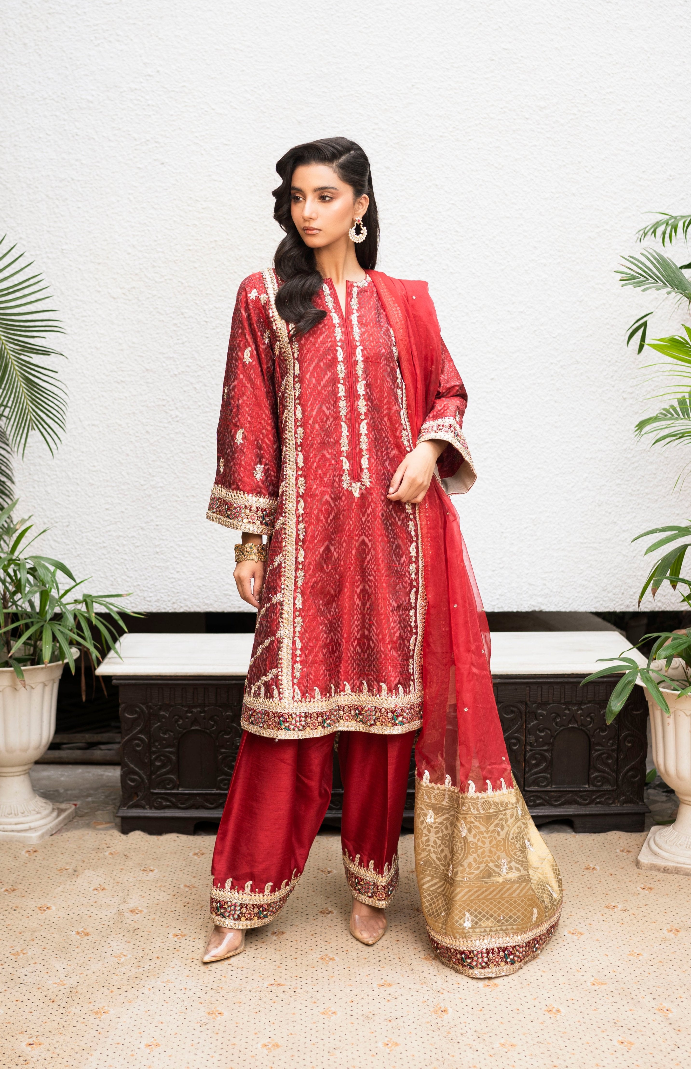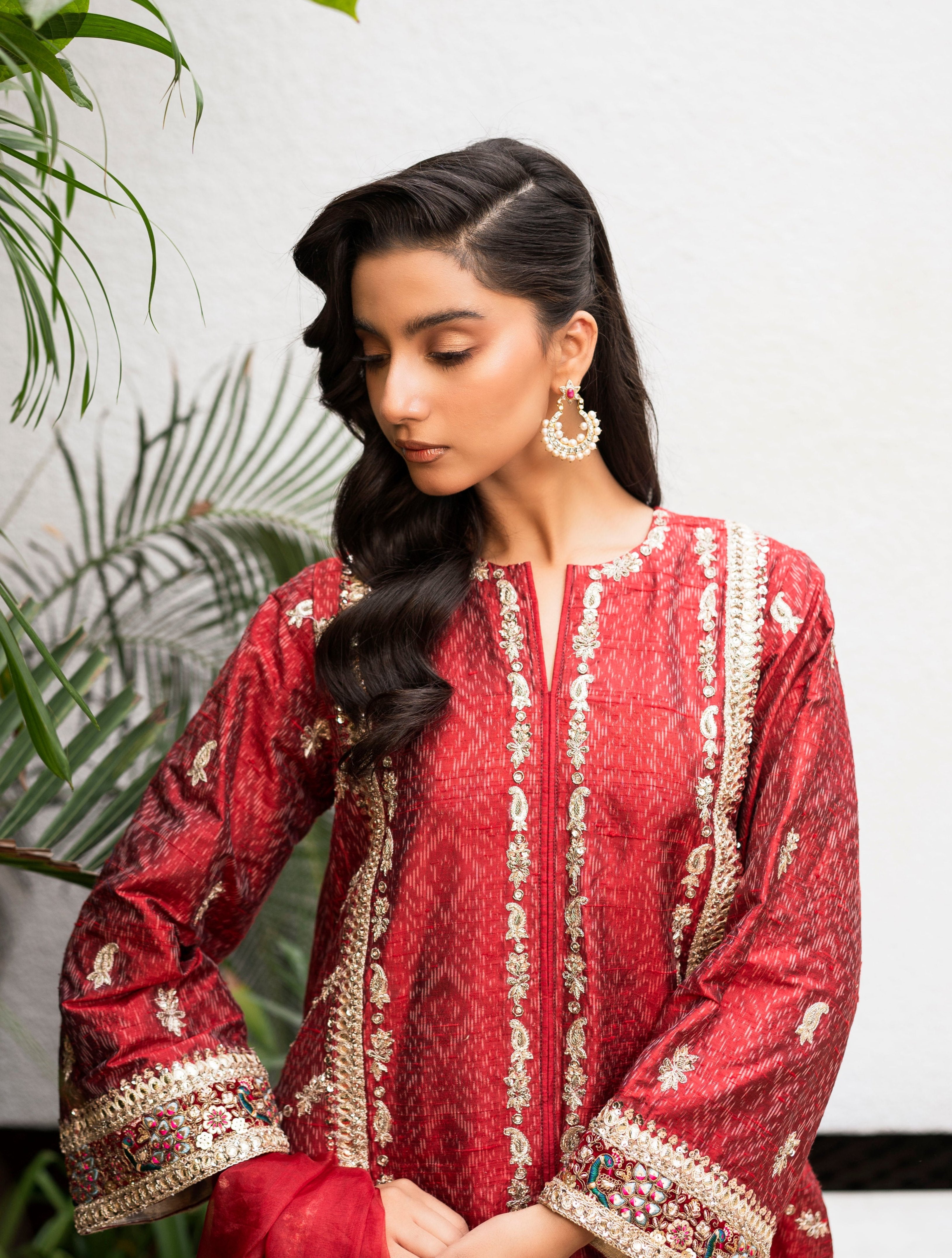 This stunning ensemble features a deep red embossed raw silk kurta, crafted with a rich, luxurious texture that exudes sophistication. The kurta is complemented by a deep red raw silk shalwar, embellished with intricate Mukesh borders that add a refined, traditional touch.