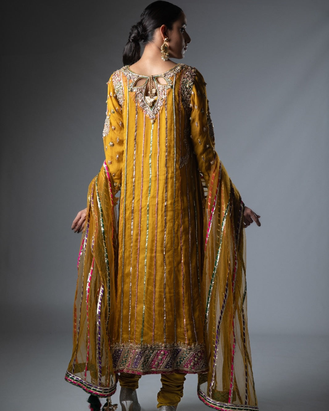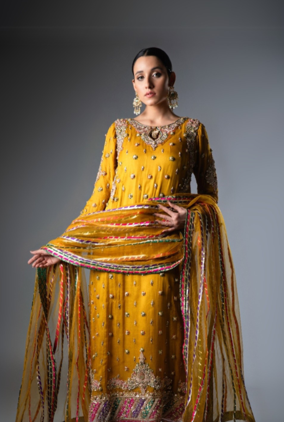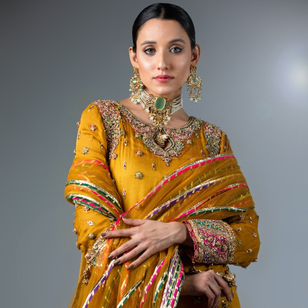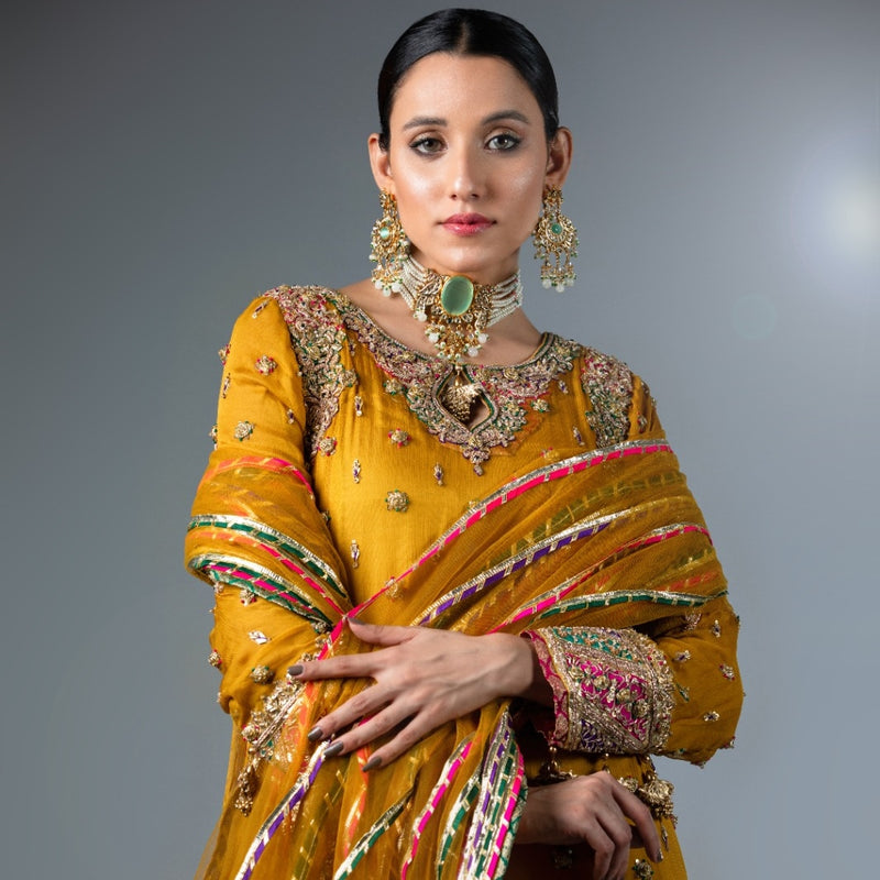 This elegant ensemble features a mustard chiffon shirt adorned with intricate Gota work and delicate Chata Patti borders, creating a sophisticated yet vibrant look.